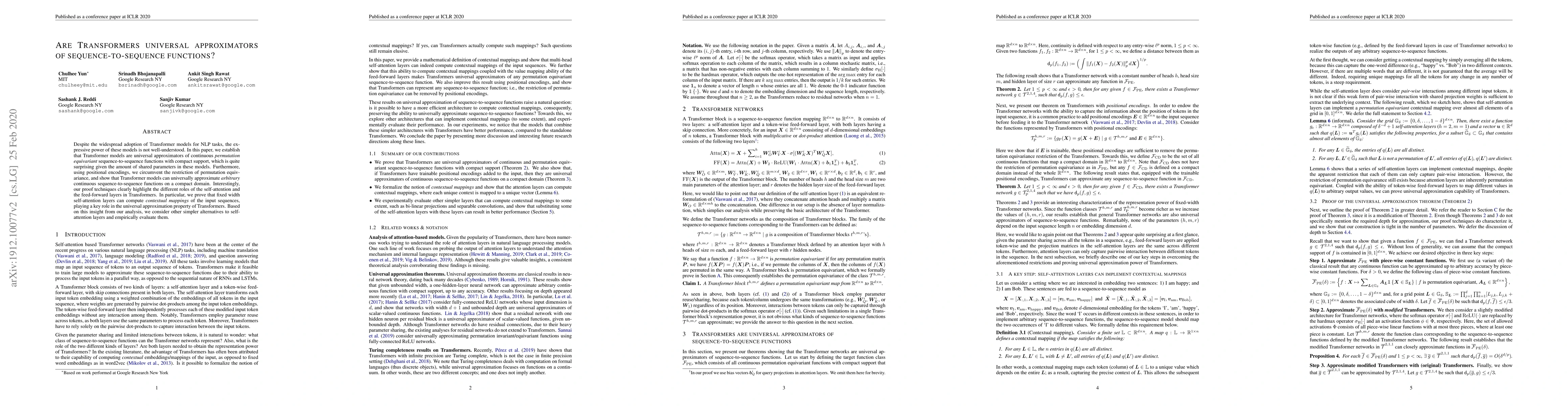 This paper demonstrates that Transformer models can universally approximate continuous sequence-to-sequence functions, highlighting the roles of self-attention and feed-forward layers. It also shows that positional encodings enable Transformers to handle non-permutation equivariant functions.