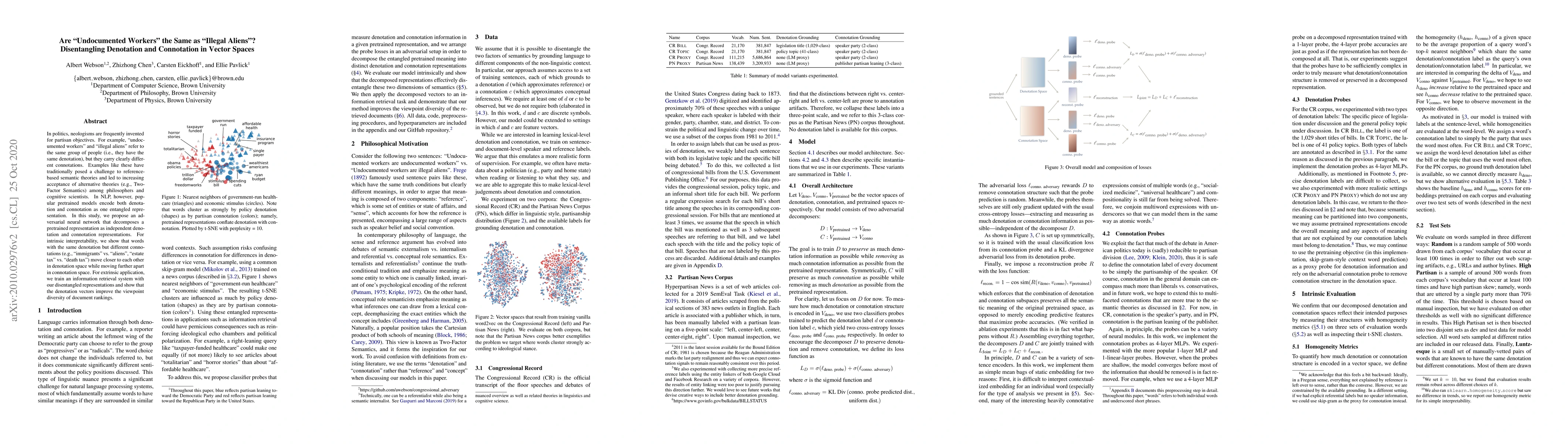 In politics, neologisms are frequently invented for partisan objectives. For example, "undocumented workers" and "illegal aliens" refer to the same group of people (i.e., they have the same denotation), but they carry clearly different connotations. Examples like these have traditionally posed a challenge to reference-based semantic theories and led to increasing acceptance of alternative theories (e.g., Two-Factor Semantics) among philosophers and cognitive scientists. In NLP, however, popular pretrained models encode both denotation and connotation as one entangled representation. In this study, we propose an adversarial neural network that decomposes a pretrained representation as independent denotation and connotation representations. For intrinsic interpretability, we show that words with the same denotation but different connotations (e.g., "immigrants" vs. "aliens", "estate tax" vs. "death tax") move closer to each other in denotation space while moving further apart in connotation space. For extrinsic application, we train an information retrieval system with our disentangled representations and show that the denotation vectors improve the viewpoint diversity of document rankings.