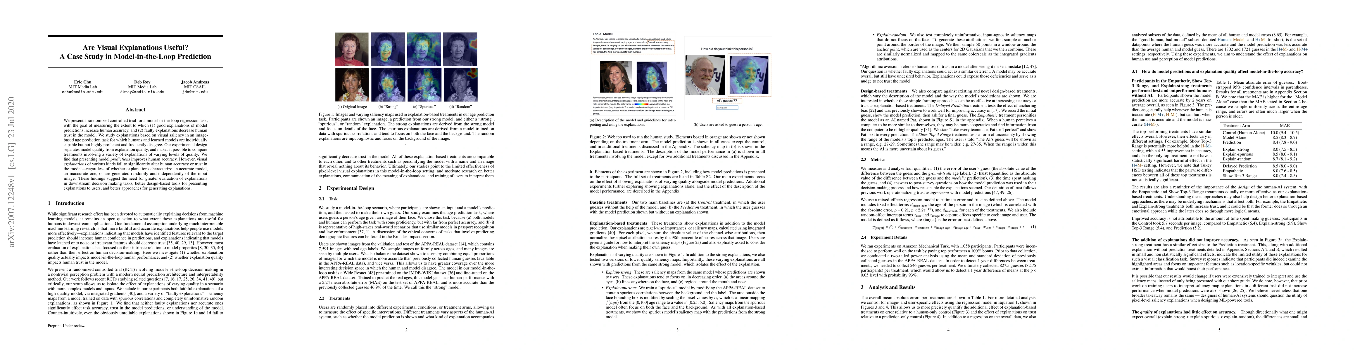 We present a randomized controlled trial for a model-in-the-loop regression task, with the goal of measuring the extent to which (1) good explanations of model predictions increase human accuracy, and (2) faulty explanations decrease human trust in the model. We study explanations based on visual saliency in an image-based age prediction task for which humans and learned models are individually capable but not highly proficient and frequently disagree. Our experimental design separates model quality from explanation quality, and makes it possible to compare treatments involving a variety of explanations of varying levels of quality. We find that presenting model predictions improves human accuracy. However, visual explanations of various kinds fail to significantly alter human accuracy or trust in the model - regardless of whether explanations characterize an accurate model, an inaccurate one, or are generated randomly and independently of the input image. These findings suggest the need for greater evaluation of explanations in downstream decision making tasks, better design-based tools for presenting explanations to users, and better approaches for generating explanations.