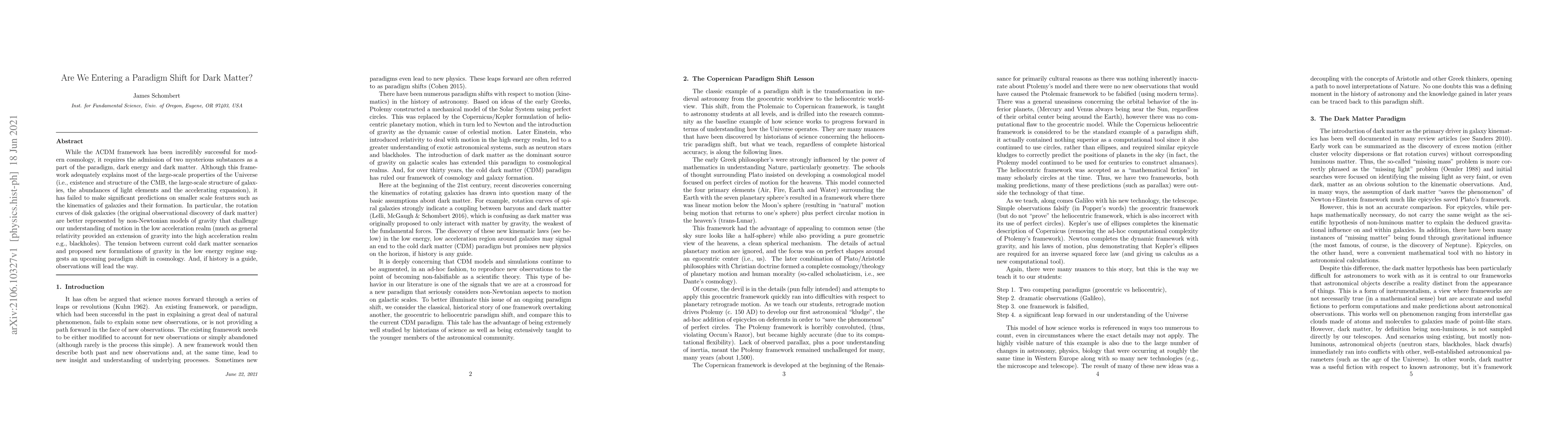 While the LCDM framework has been incredibly successful for modern cosmology, it requires the admission of two mysterious substances as a part of the paradigm, dark energy and dark matter. Although this framework adequately explains most of the large-scale properties of the Universe (i.e., existence and structure of the CMB, the large-scale structure of galaxies, the abundances of light elements and the accelerating expansion), it has failed to make significant predictions on smaller scale features such as the kinematics of galaxies and their formation. In particular, the rotation curves of disk galaxies (the original observational discovery of dark matter) are better represented by non-Newtonian models of gravity that challenge our understanding of motion in the low acceleration realm (much as general relativity provided an extension of gravity into the high acceleration realm e.g., blackholes). The tension between current cold dark matter scenarios and proposed new formulations of gravity in the low energy regime suggests an upcoming paradigm shift in cosmology. And, if history is a guide, observations will lead the way.