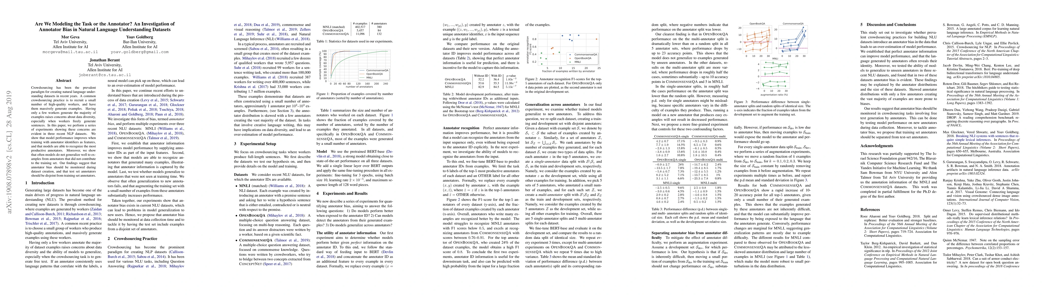 This paper investigates annotator bias in natural language understanding datasets created via crowdsourcing, highlighting that models often perform better when trained with annotator identifiers. The study finds that models tend to recognize the most productive annotators and do not generalize well to new annotators, suggesting the need for careful monitoring of annotator bias and the use of disjoint annotators for training and testing sets.