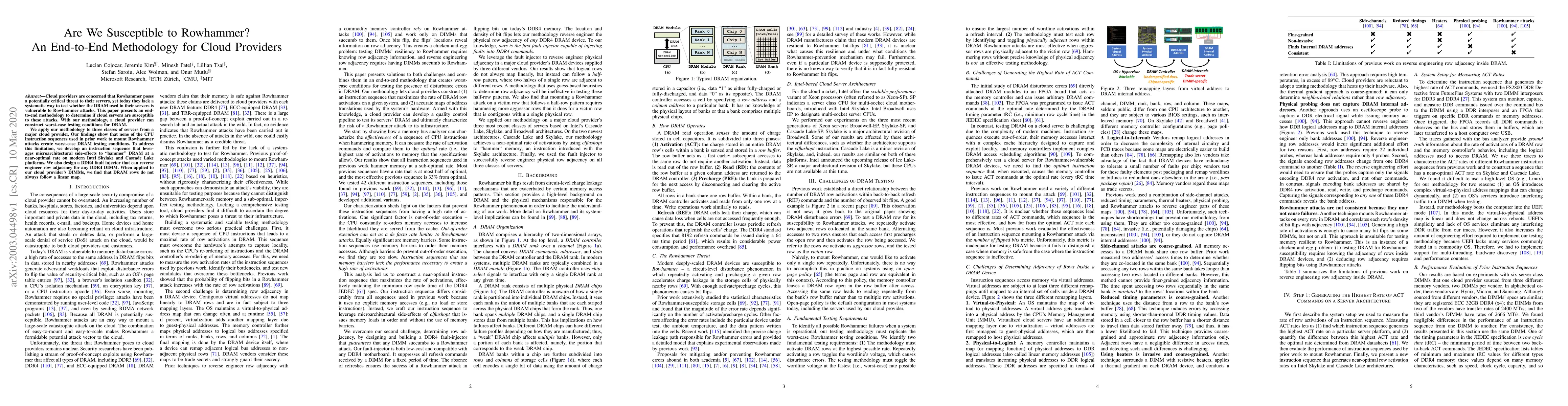 Researchers developed an end-to-end methodology to test for Rowhammer attacks on cloud servers, finding that none of previous instruction sequences created worst-case testing conditions, but discovering DRAM rows do not always follow a linear map.