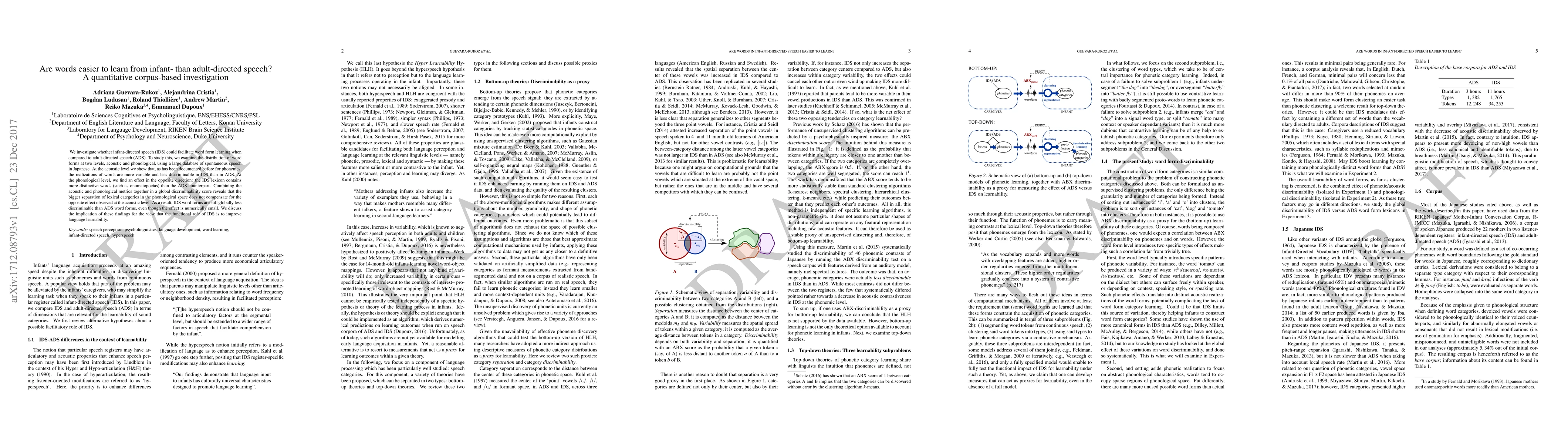 We investigate whether infant-directed speech (IDS) could facilitate word form learning when compared to adult-directed speech (ADS). To study this, we examine the distribution of word forms at two levels, acoustic and phonological, using a large database of spontaneous speech in Japanese. At the acoustic level we show that, as has been documented before for phonemes, the realizations of words are more variable and less discriminable in IDS than in ADS. At the phonological level, we find an effect in the opposite direction: the IDS lexicon contains more distinctive words (such as onomatopoeias) than the ADS counterpart. Combining the acoustic and phonological metrics together in a global discriminability score reveals that the bigger separation of lexical categories in the phonological space does not compensate for the opposite effect observed at the acoustic level. As a result, IDS word forms are still globally less discriminable than ADS word forms, even though the effect is numerically small. We discuss the implication of these findings for the view that the functional role of IDS is to improve language learnability.