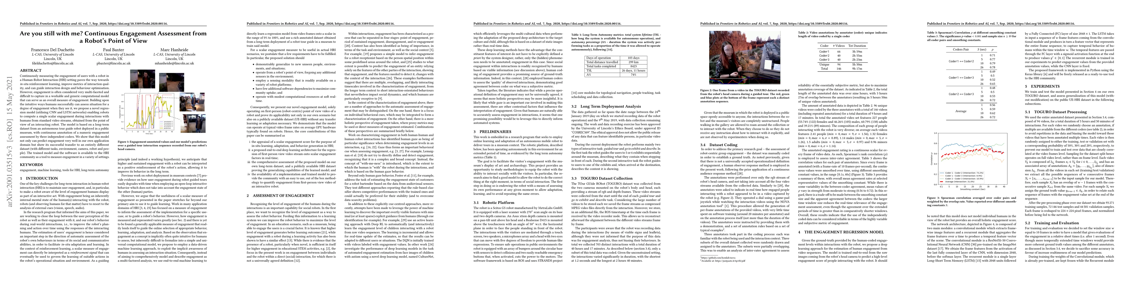 Continuously measuring the engagement of users with a robot in a Human-Robot Interaction (HRI) setting paves the way towards in-situ reinforcement learning, improve metrics of interaction quality, and can guide interaction design and behaviour optimisation. However, engagement is often considered very multi-faceted and difficult to capture in a workable and generic computational model that can serve as an overall measure of engagement. Building upon the intuitive ways humans successfully can assess situation for a degree of engagement when they see it, we propose a novel regression model (utilising CNN and LSTM networks) enabling robots to compute a single scalar engagement during interactions with humans from standard video streams, obtained from the point of view of an interacting robot. The model is based on a long-term dataset from an autonomous tour guide robot deployed in a public museum, with continuous annotation of a numeric engagement assessment by three independent coders. We show that this model not only can predict engagement very well in our own application domain but show its successful transfer to an entirely different dataset (with different tasks, environment, camera, robot and people). The trained model and the software is available to the HRI community as a tool to measure engagement in a variety of settings.