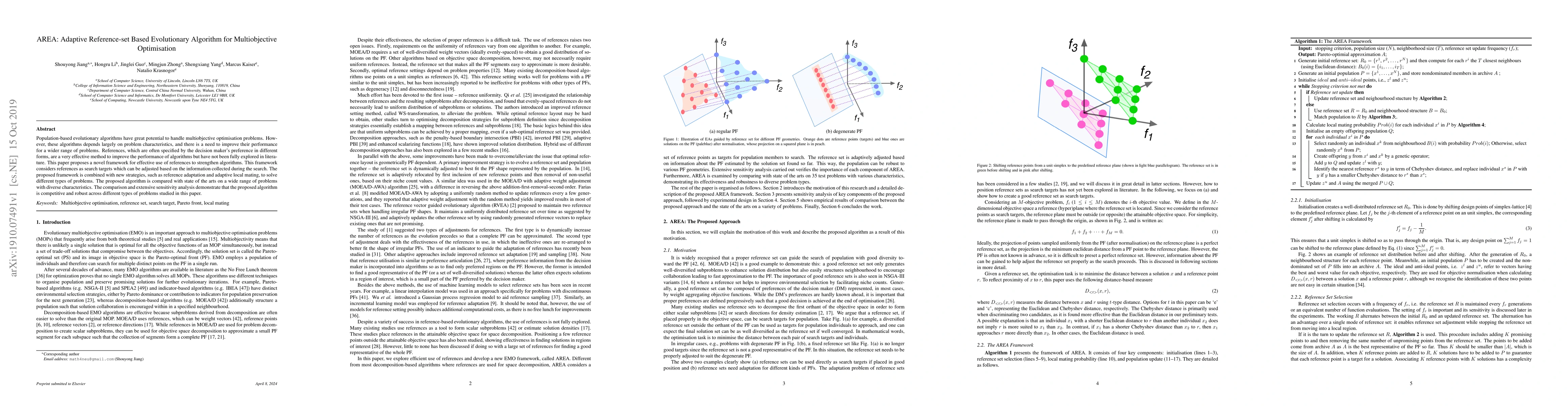 This paper introduces an Adaptive Reference-set Based Evolutionary Algorithm (AREA) for multiobjective optimisation, leveraging adaptive reference points to enhance algorithm performance. The proposed framework, combined with adaptive local mating, demonstrates competitive and robust results across various problem types compared to state-of-the-art methods.
