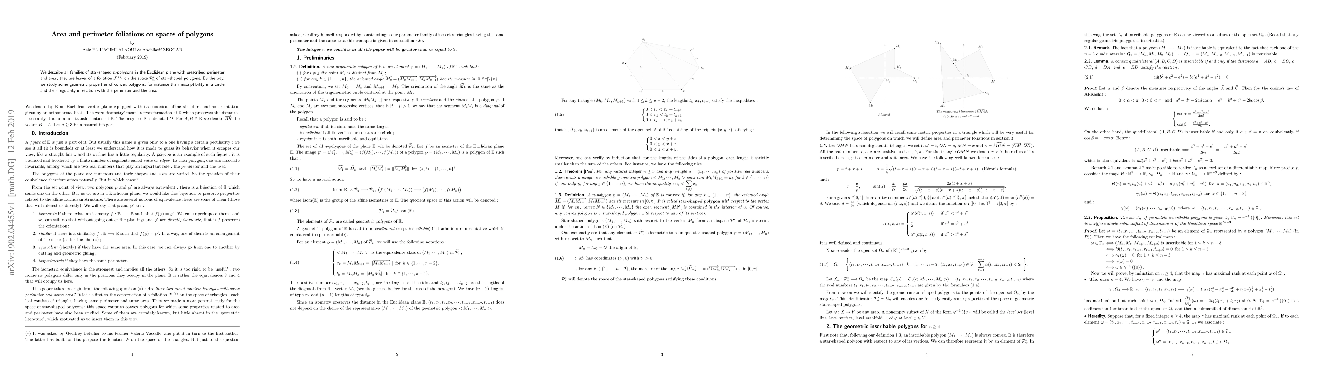 Summary: The paper explores foliations of star-shaped n-polygons in the Euclidean plane with fixed perimeter and area, and examines geometric properties of convex polygons, including their inscribability and regularity relative to these parameters.
