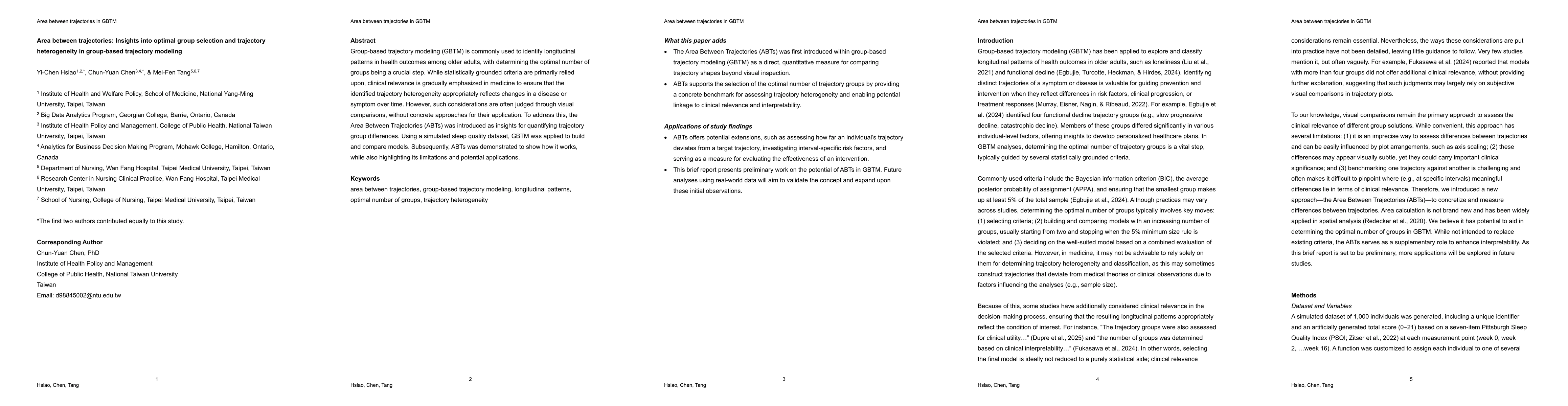 This research introduces Area Between Trajectories (ABTs), a method to quantify differences between trajectory groups in Group-based Trajectory Modeling (GBTM). Applied to a sleep quality dataset, ABTs provides insights into optimal group selection and trajectory heterogeneity, addressing the need for concrete approaches to evaluate clinical relevance in identified patterns.
