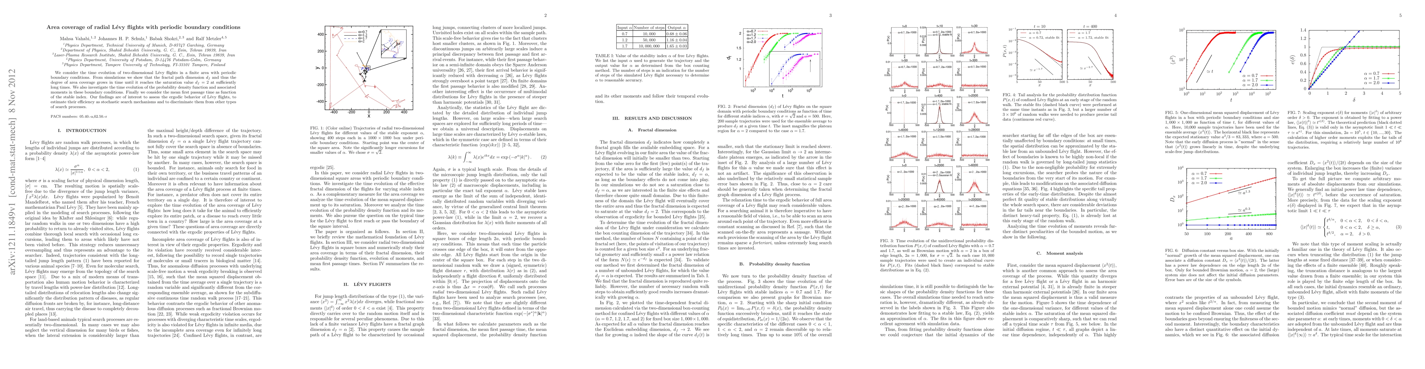 This research examines two-dimensional Levy flights in a finite area with periodic boundaries, revealing that the fractal path dimension and area coverage increase over time to saturate at d_f=2. The study also explores the time evolution of probability density and moments, along with the mean first passage time's relation to the stable index. Findings impact understanding of ergodic behavior, search efficiency, and differentiation from other search processes in Levy flights.