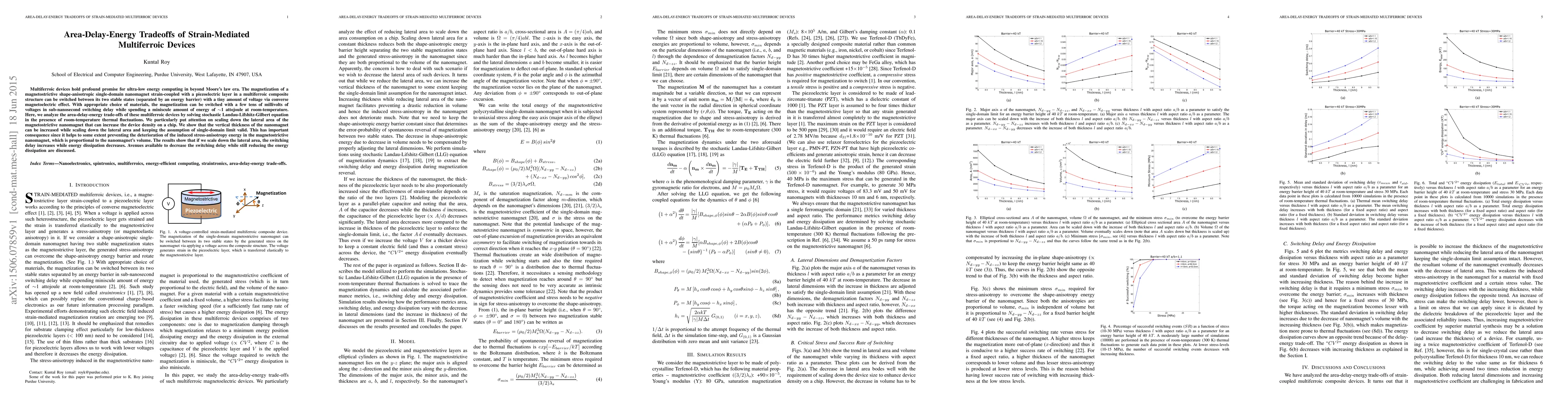 Multiferroic devices hold profound promise for ultra-low energy computing in beyond Moore's law era. The magnetization of a magnetostrictive shape-anisotropic single-domain nanomagnet strain-coupled with a piezoelectric layer in a multiferroic composite structure can be switched between its two stable states (separated by an energy barrier) with a tiny amount of voltage via converse magnetoelectric effect. With appropriate choice of materials, the magnetization can be switched with a few tens of millivolts of voltages in sub-nanosecond switching delay while spending a miniscule amount of energy of ~1 attojoule at room-temperature. Here, we analyze the area-delay-energy trade-offs of these multiferroic devices by solving stochastic Landau-Lifshitz-Gilbert equation in the presence of room-temperature thermal fluctuations. We particularly put attention on scaling down the lateral area of the magnetostrictive nanomagnet that can increase the device density on a chip. We show that the vertical thickness of the nanomagnet can be increased while scaling down the lateral area and keeping the assumption of single-domain limit valid. This has important consequence since it helps to some extent preventing the deterioration of the induced stress-anisotropy energy in the magnetostrictive nanomagnet, which is proportional to the nanomagnet's volume. The results show that if we scale down the lateral area, the switching delay increases while energy dissipation decreases. Avenues available to decrease the switching delay while still reducing the energy dissipation are discussed.