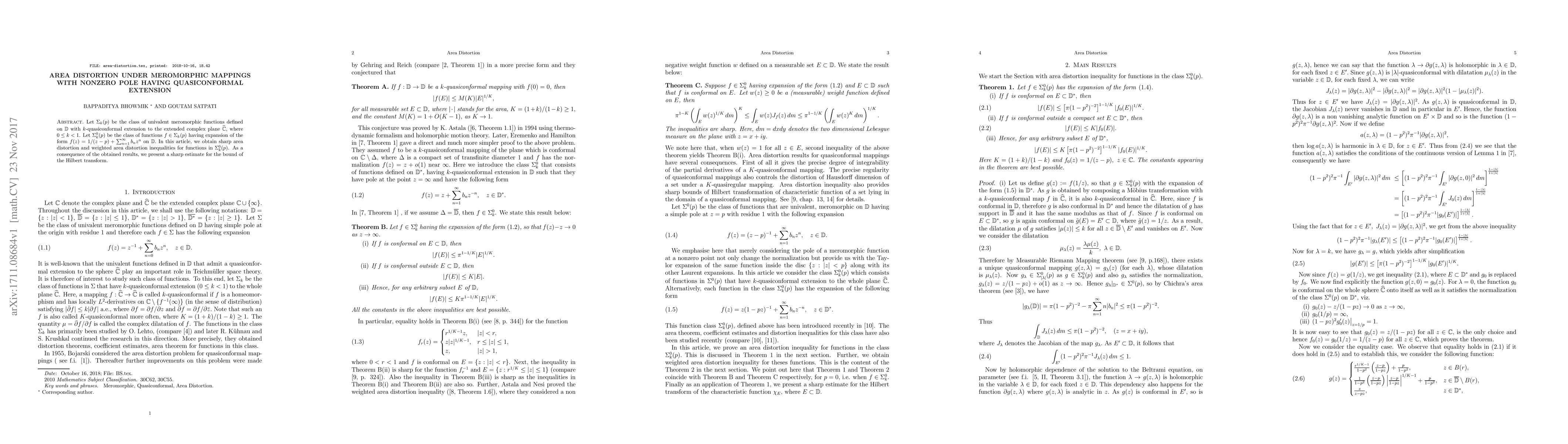 Let $\Sigma_k(p)$ be the class of univalent meromorphic functions defined on $\mathbb{D}$ with $k$-quasiconformal extension to the extended complex plane $\widehat{\mathbb{C}}$, where $0\leq k < 1$. Let $\Sigma_k^0(p)$ be the class of functions $f \in \Sigma_k(p)$ having expansion of the form $f(z)= 1/(z-p) + \sum_{n=1}^{\infty}b_n z^{n}$ on $\mathbb{D}$. In this article, we obtain sharp area distortion and weighted area distortion inequalities for functions in $\Sigma_k^0(p)$. As a consequence of the obtained results, we present a sharp estimate for the bounds of the Hilbert transform.