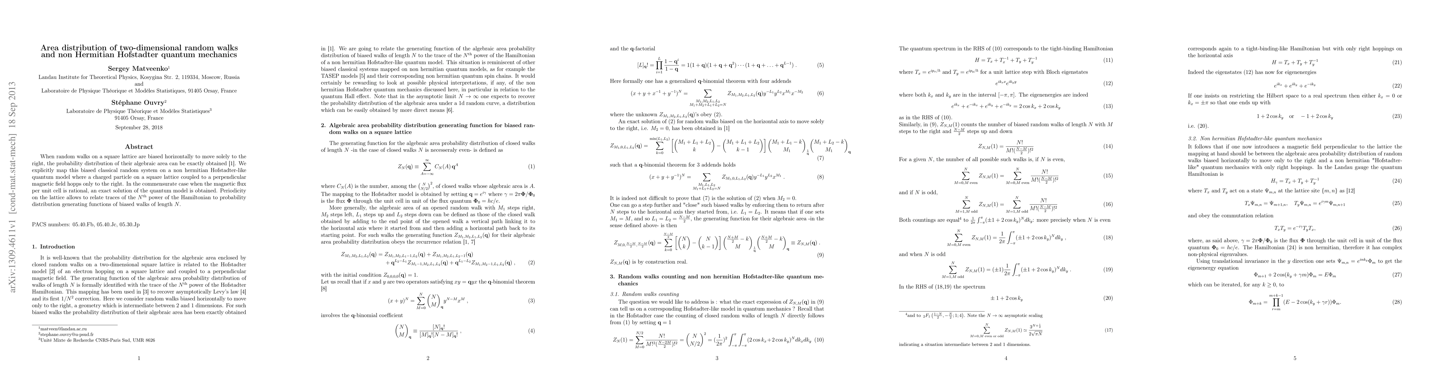 This paper investigates the probability distribution of biased two-dimensional random walks and maps this classical system onto a non-Hermitian Hofstadter quantum model. An exact solution is derived for the quantum model in the commensurate case, linking the Hamiltonian's traces to the generating functions of the classical random walk's area.