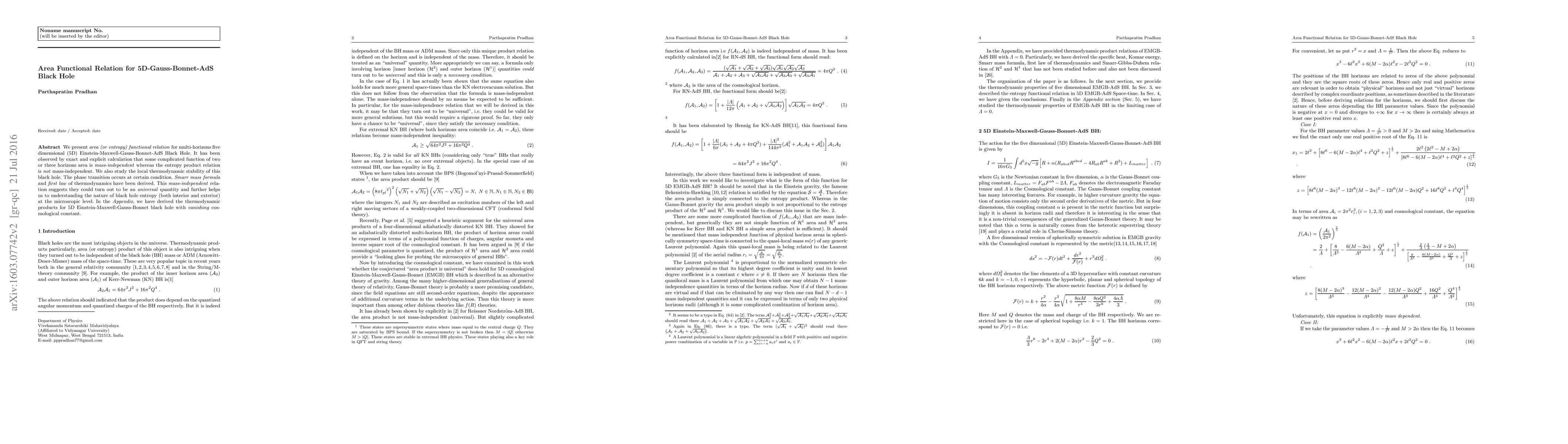 We present \emph{area (or entropy) functional relation} for multi-horizons five dimensional (5D) Einstein-Maxwell-Gauss-Bonnet-AdS Black Hole. It has been observed by exact and explicit calculation that some complicated function of two or three horizons area is \emph{mass-independent} whereas the entropy product relation is \emph{not} mass-independent. We also study the local thermodynamic stability of this black hole. The phase transition occurs at certain condition. \emph{Smarr mass formula} and \emph{first law} of thermodynamics have been derived. This \emph{mass-independent} relation suggests they could turn out to be an \emph{universal} quantity and further helps us to understanding the nature of black hole entropy (both interior and exterior) at the microscopic level. In the \emph{Appendix}, we have derived the thermodynamic products for 5D Einstein-Maxwell-Gauss-Bonnet black hole with \emph{vanishing} cosmological constant.