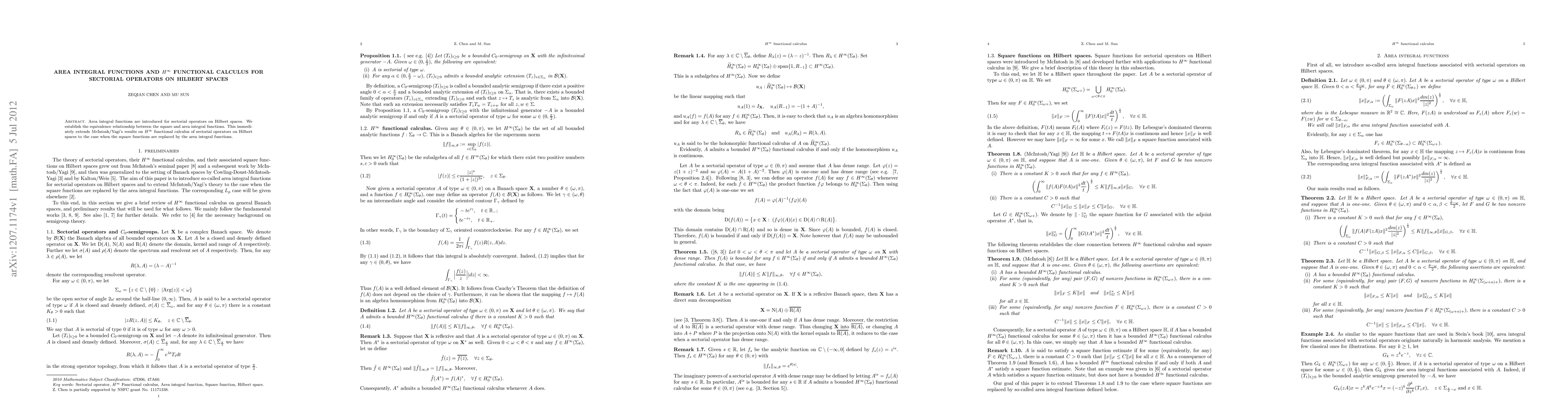 Summary: This paper introduces area integral functions for sectorial operators on Hilbert spaces and establishes their equivalence to square integral functions, extending McIntosh/Yagi's $H^{\8}$ functional calculus results to use area integrals instead of squares.