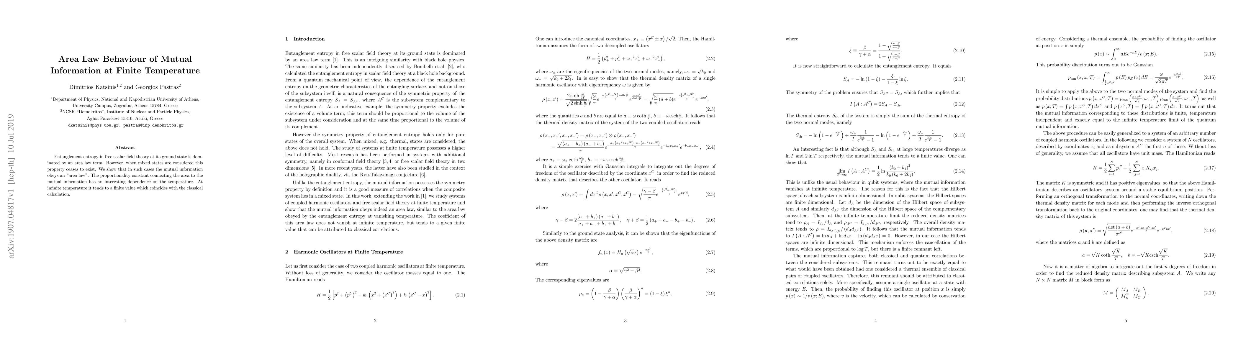 This paper demonstrates that mutual information in free scalar field theory obeys an area law at finite temperatures, contrasting the entanglement entropy behavior in mixed states. The proportionality constant linking area to mutual information varies with temperature, reaching a finite value at infinite temperature, aligning with classical calculations.
