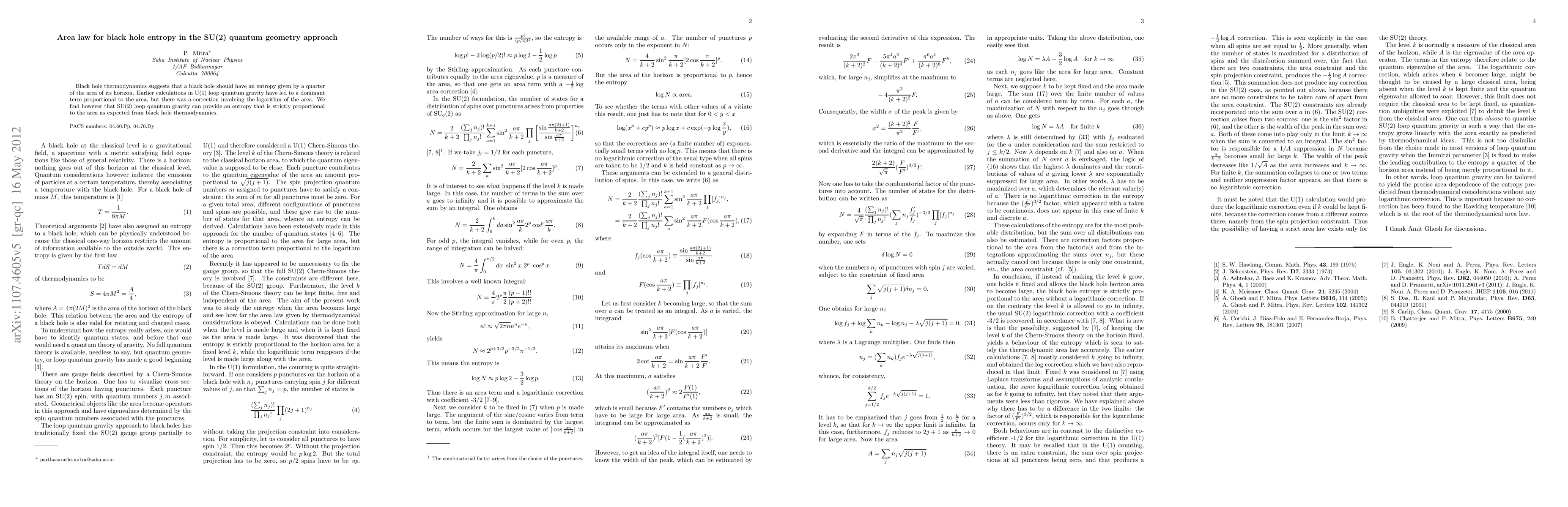 This paper demonstrates that the SU(2) quantum geometry approach in loop quantum gravity yields black hole entropy strictly proportional to the area of its horizon, without the logarithmic correction found in U(1) loop quantum gravity, aligning with black hole thermodynamics predictions.