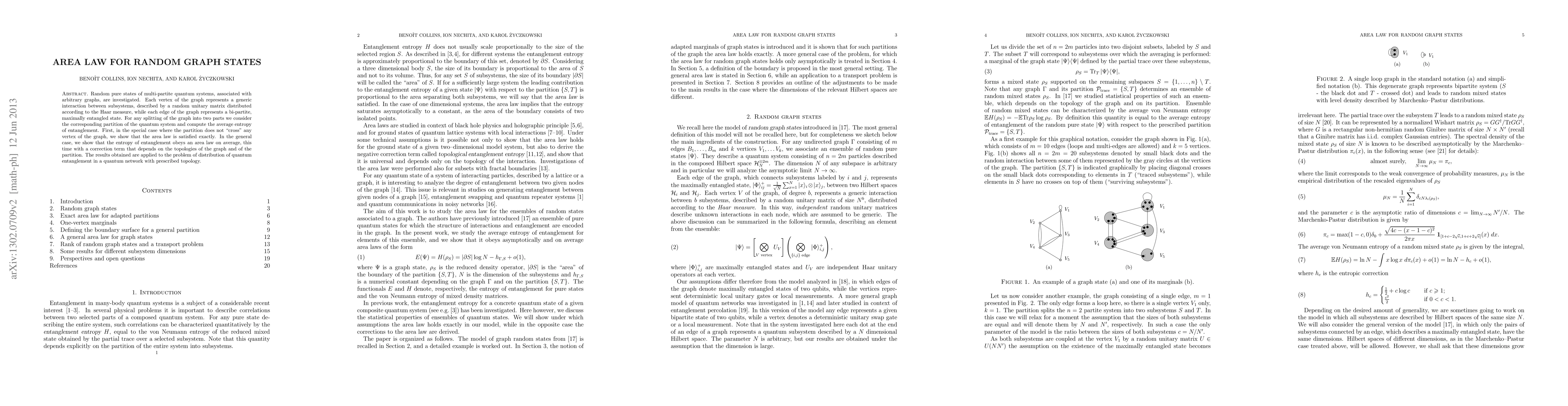 Random pure states of multi-partite quantum systems, associated with arbitrary graphs, are investigated. Each vertex of the graph represents a generic interaction between subsystems, described by a random unitary matrix distributed according to the Haar measure, while each edge of the graph represents a bi-partite, maximally entangled state. For any splitting of the graph into two parts we consider the corresponding partition of the quantum system and compute the average entropy of entanglement. First, in the special case where the partition does not "cross" any vertex of the graph, we show that the area law is satisfied exactly. In the general case, we show that the entropy of entanglement obeys an area law on average, this time with a correction term that depends on the topologies of the graph and of the partition. The results obtained are applied to the problem of distribution of quantum entanglement in a quantum network with prescribed topology.