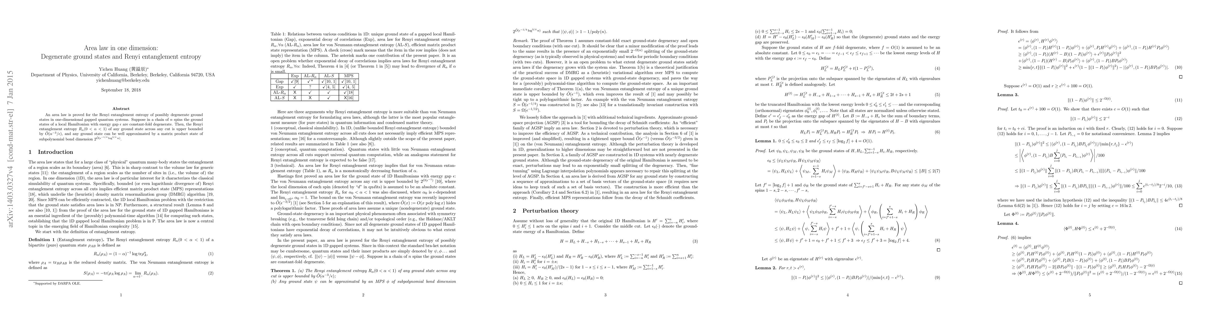 Summary: The paper proves an area law for Renyi entanglement entropy in one-dimensional gapped quantum systems with degenerate ground states, showing that the entropy is upper bounded by a function of the energy gap, and that ground states can be approximated by matrix product states with subpolynomial bond dimension.