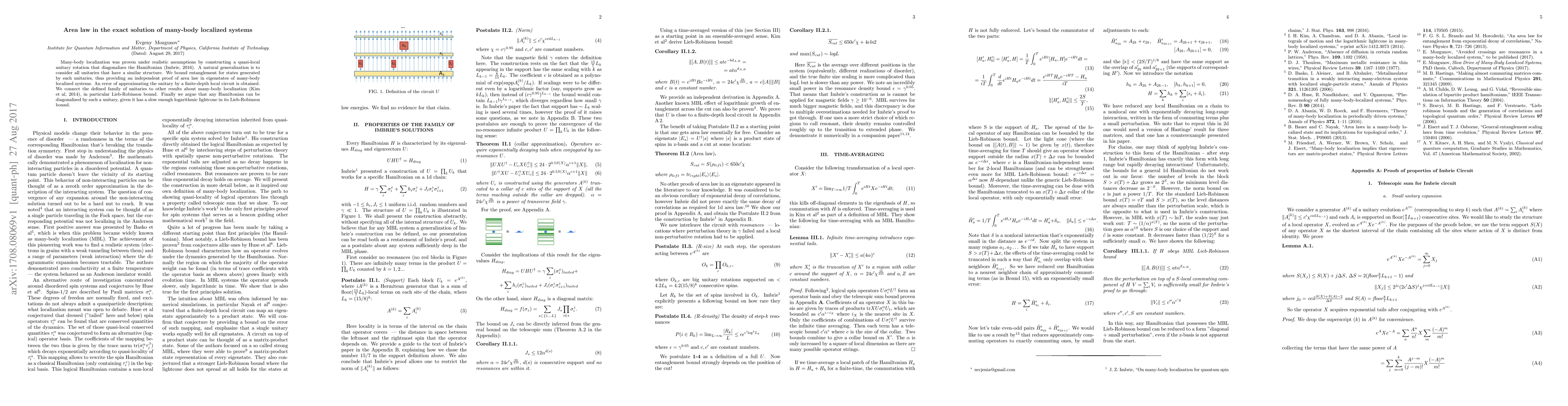 Many-body localization was proven under realistic assumptions by constructing a quasi-local unitary rotation that diagonalizes the Hamiltonian (Imbrie, 2016). A natural generalization is to consider all unitaries that have a similar structure. We bound entanglement for states generated by such unitaries, thus providing an independent proof of area law in eigenstates of many-body localized systems. An error of approximating the unitary by a finite-depth local circuit is obtained. We connect the defined family of unitaries to other results about many-body localization (Kim et al, 2014), in particular Lieb-Robinson bound. Finally we argue that any Hamiltonian can be diagonalized by such a unitary, given it has a slow enough logarithmic lightcone in its Lieb-Robinson bound.