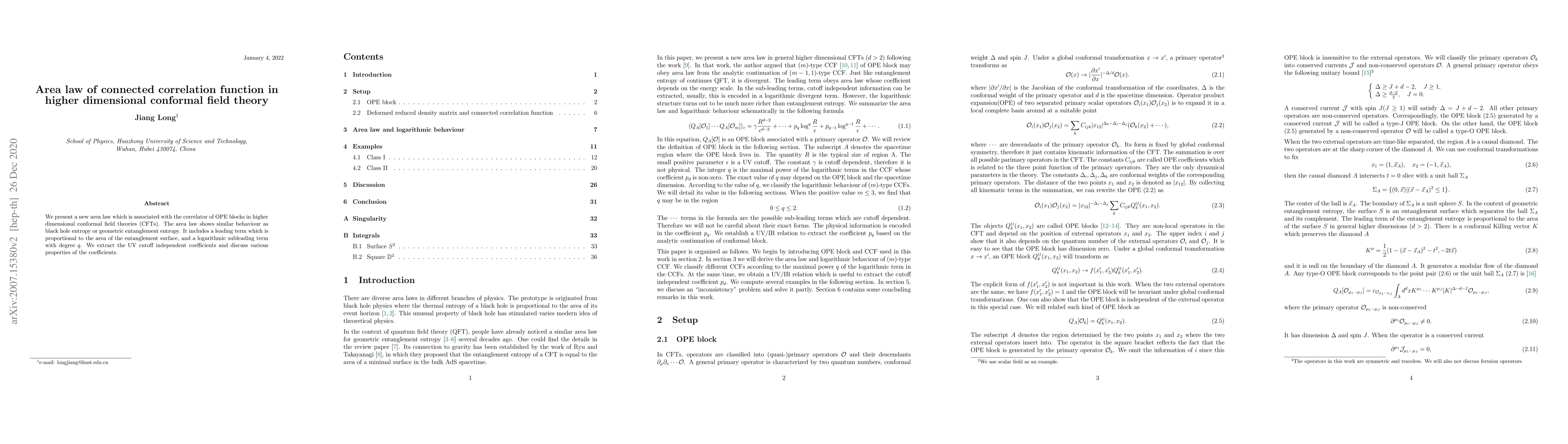 We present a new area law which is associated with the correlator of OPE blocks in higher dimensional conformal field theories (CFTs). The area law shows similar behaviour as black hole entropy or geometric entanglement entropy. It includes a leading term which is proportional to the area of the entanglement surface, and a logarithmic subleading term with degree $q$. We extract the UV cutoff independent coefficients and discuss various properties of the coefficients.