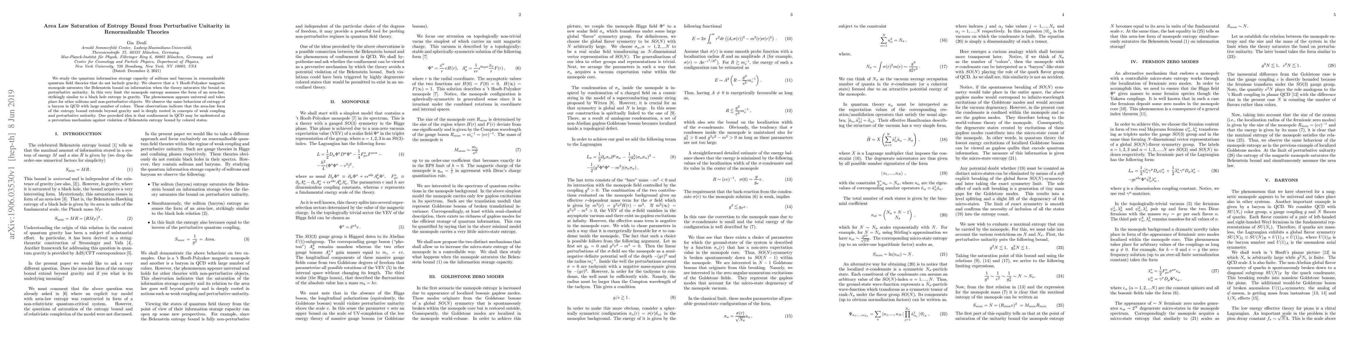 This paper investigates the quantum information storage capacity in solitons and baryons within renormalizable quantum field theories, finding that 't Hooft-Polyakov monopoles saturate the Bekenstein entropy bound under perturbative unitarity. The entropy exhibits an area-law, akin to black hole entropy, suggesting a universal phenomenon rooted in weak coupling and perturbative unitarity, hinting at confinement in QCD as a mechanism preventing entropy bound violations.