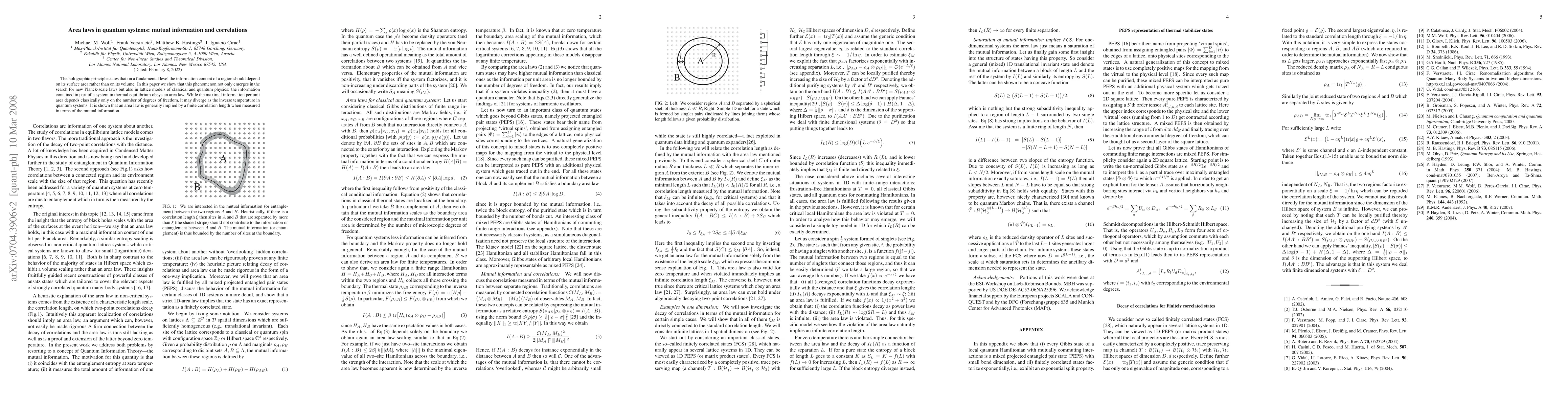 This paper demonstrates that the information content in a thermal equilibrium system obeys an area law, similar to the holographic principle, where the information is proportional to the boundary rather than the volume. It shows that while classical systems have a finite maximal information per unit area, quantum systems can exhibit a divergence in this information as the inverse temperature, establishing a rigorous link between area laws and correlations in quantum many-body states.