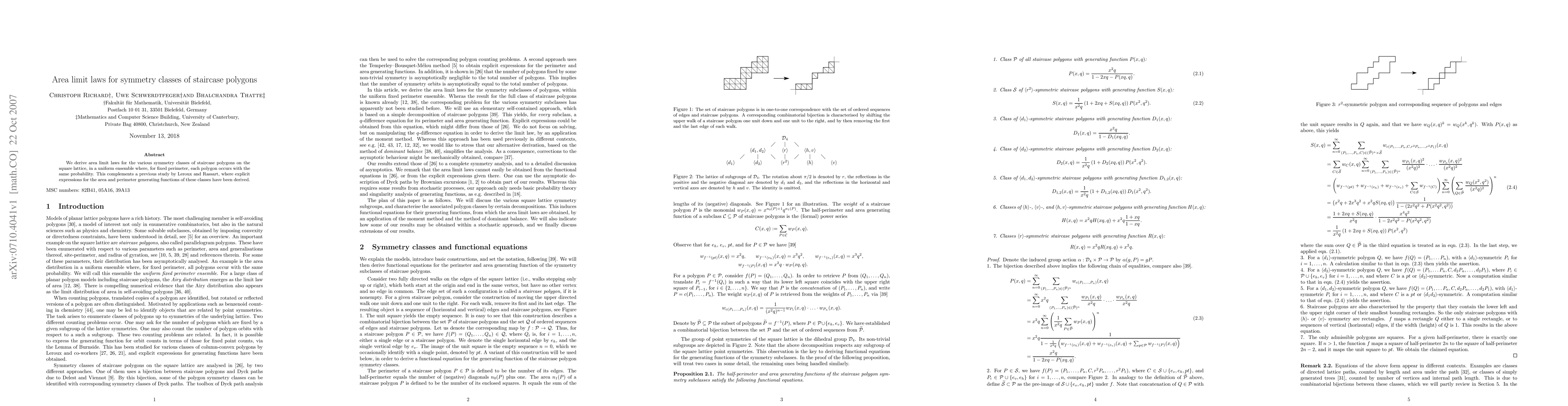 This paper derives area limit laws for different symmetry classes of staircase polygons on the square lattice, where each polygon has an equal probability for a fixed perimeter. This work builds on previous research by Leroux and Rassart that established generating functions for area and perimeter of these classes.