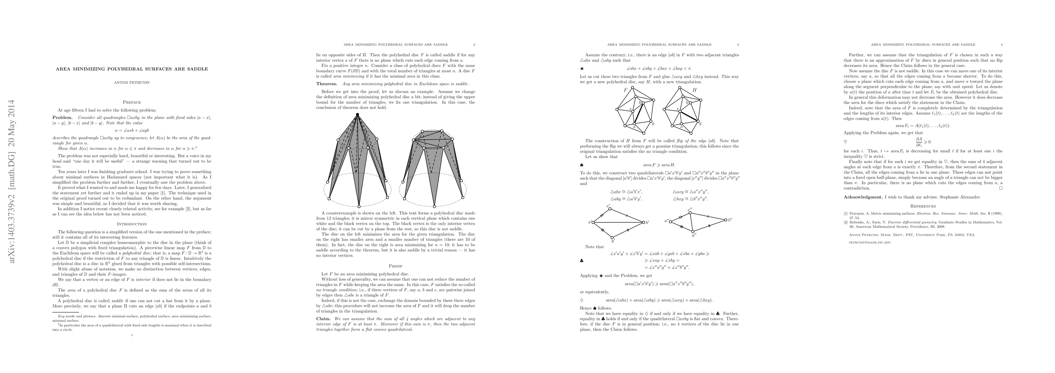 Summary: This paper demonstrates that polyhedral surfaces that minimize surface area exhibit saddle-like characteristics, indicating a unique geometric property in minimal surfaces.