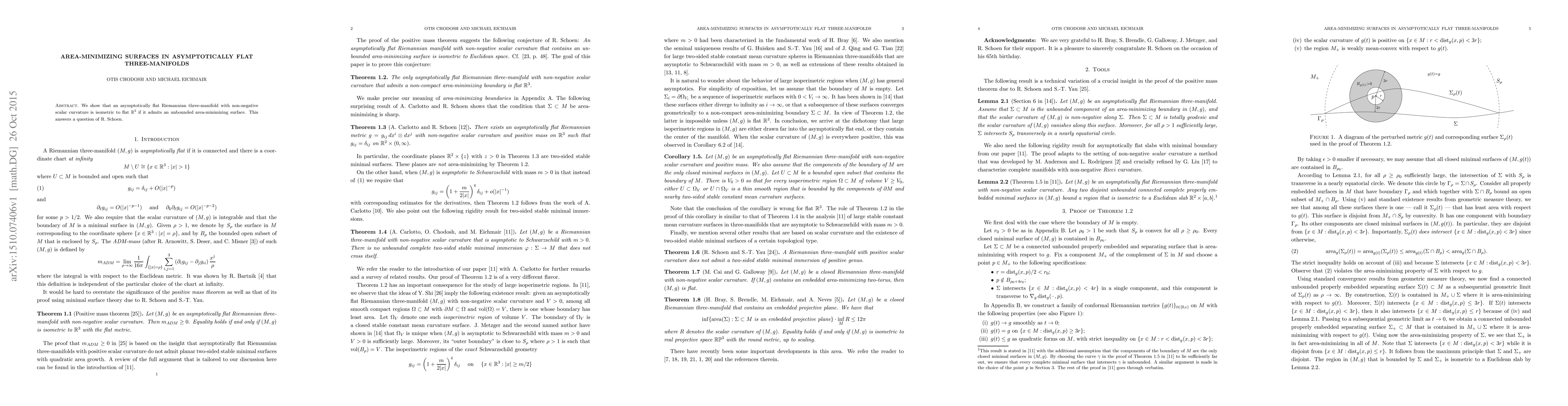 We show that an asymptotically flat Riemannian three-manifold with non-negative scalar curvature is isometric to flat $\mathbb{R}^3$ if it admits an unbounded area-minimizing surface. This answers a question of R. Schoen.