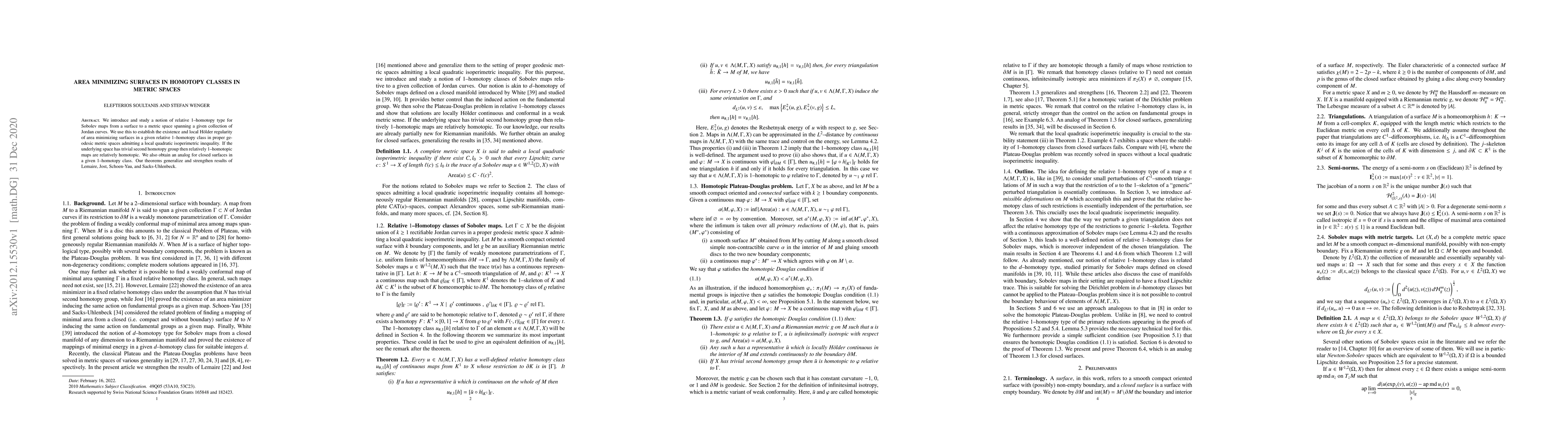 We introduce and study a notion of relative 1-homotopy type for Sobolev maps from a surface to a metric space spanning a given collection of Jordan curves. We use this to establish the existence and local H\"older regularity of area minimizing surfaces in a given relative 1-homotopy class in proper geodesic metric spaces admitting a local quadratic isoperimetric inequality. If the underlying space has trivial second homotopy group then relatively 1-homotopic maps are relatively homotopic. We also obtain an analog for closed surfaces in a given 1-homotopy class. Our theorems generalize and strengthen results of Lemaire, Jost, Schoen-Yau, and Sacks-Uhlenbeck.