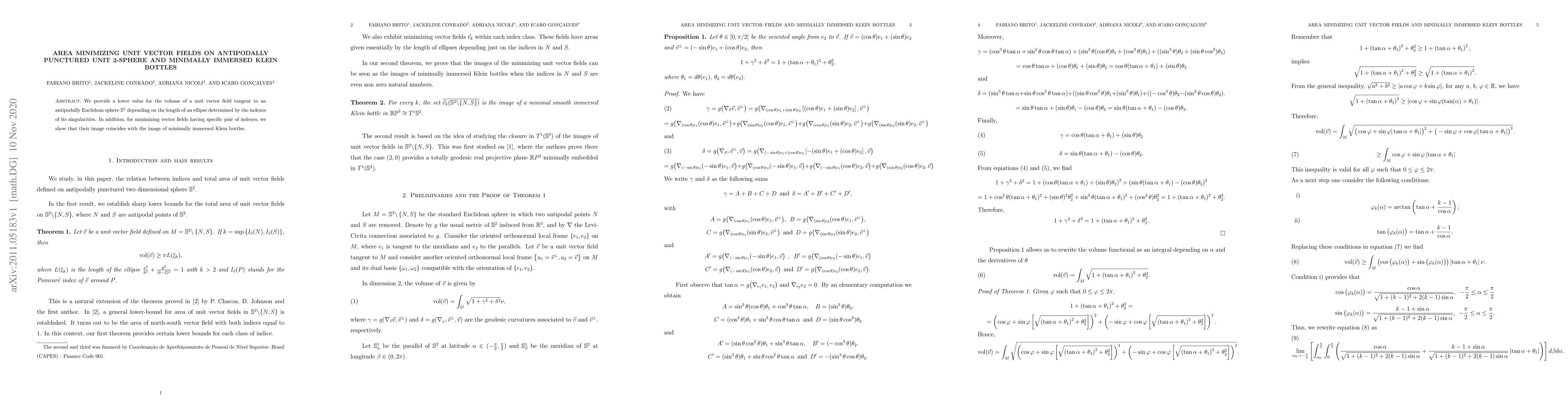 This paper establishes a lower bound for the volume of unit vector fields on an antipodally punctured unit 2-sphere based on the length of an associated ellipse defined by the singularities' indexes. It also demonstrates that minimizing vector fields with specific index pairs correspond to the images of minimally immersed Klein bottles.