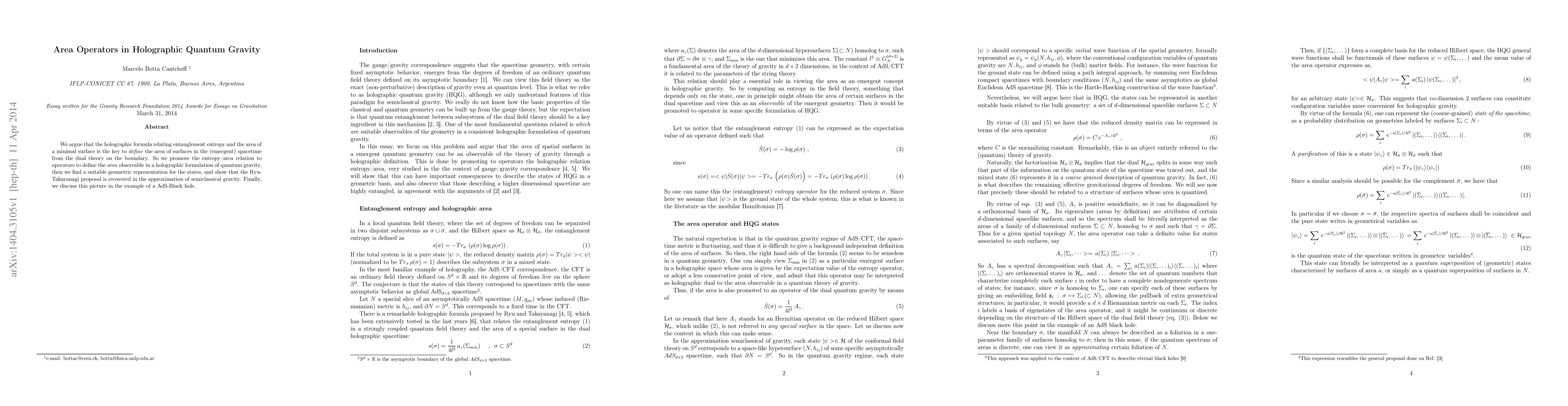 We argue that the holographic formula relating entanglement entropy and the area of a minimal surface is the key to define the area of surfaces in the (emergent) spacetime from the dual theory on the boundary. So we promote the entropy/area relation to operators to define the "area" observable in a holographic formulation of quantum gravity, then we find a suitable geometric representation for the states, and show that the Ryu-Takayanagi proposal is recovered in the approximation of semi-classical gravity. Finally, we discuss this picture in the example of a AdS-Black hole.
