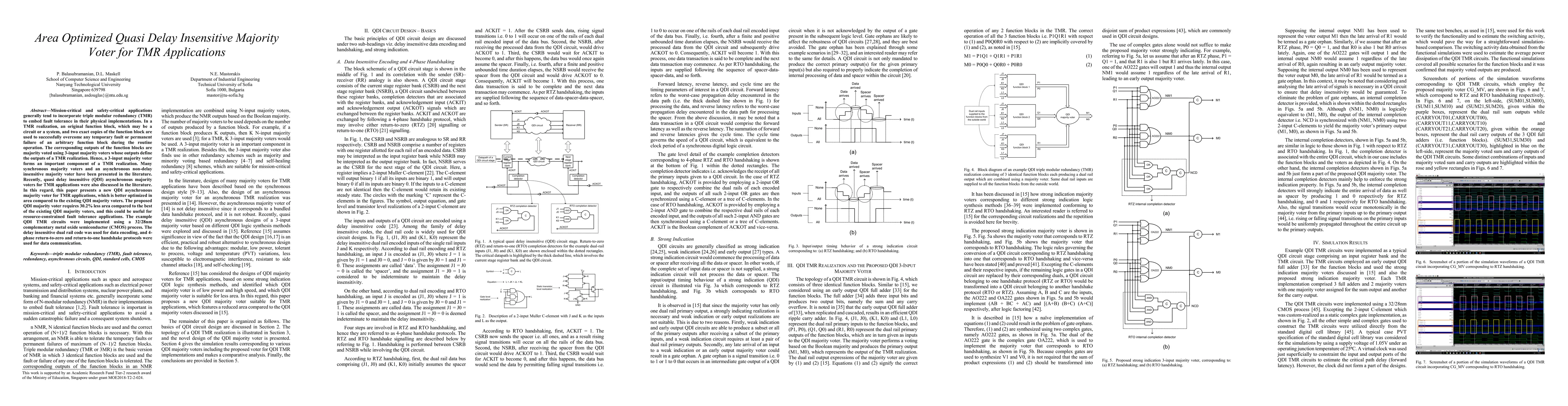 Mission-critical and safety-critical applications generally tend to incorporate triple modular redundancy (TMR) to embed fault tolerance in their physical implementations. In a TMR realization, an original function block, which may be a circuit or a system, and two exact copies of the function block are used to successfully overcome any temporary fault or permanent failure of an arbitrary function block during the routine operation. The corresponding outputs of the function blocks are majority voted using 3-input majority voters whose outputs define the outputs of a TMR realization. Hence, a 3-input majority voter forms an important component of a TMR realization. Many synchronous majority voters and an asynchronous non-delay insensitive majority voter have been presented in the literature. Recently, quasi delay insensitive (QDI) asynchronous majority voters for TMR applications were also discussed in the literature. In this regard, this paper presents a new QDI asynchronous majority voter for TMR applications, which is better optimized in area compared to the existing QDI majority voters. The proposed QDI majority voter requires 30.2% less area compared to the best of the existing QDI majority voters, and this could be useful for resource-constrained fault tolerance applications. The example QDI TMR circuits were implemented using a 32/28nm complementary metal oxide semiconductor (CMOS) process. The delay insensitive dual rail code was used for data encoding, and 4-phase return-to-zero and return-to-one handshake protocols were used for data communication.