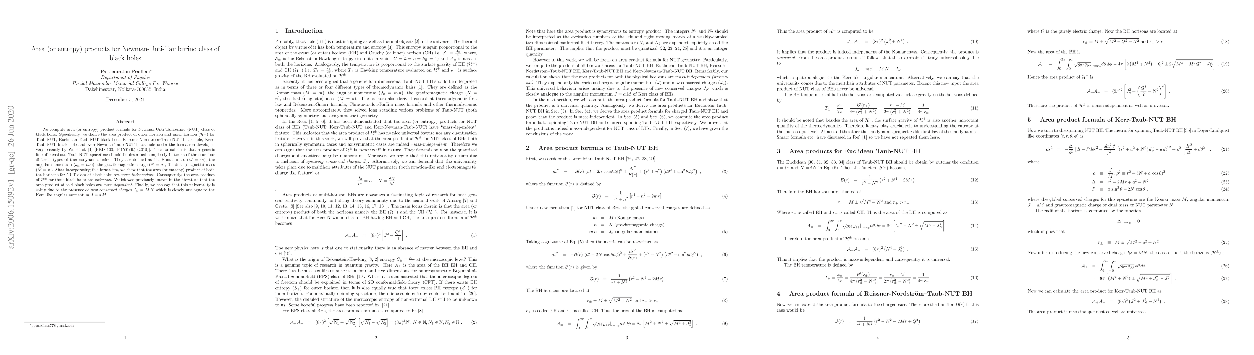 We compute area (or entropy) product formula for Newman-Unti-Tamburino (NUT) class of black holes. Specifically, we derive the area product of outer horizon and inner horizon (${ \mathcal{H}}^{\pm }$) for Taub-NUT, Euclidean Taub-NUT black hole, Reissner-Nordstr\"{o}m--Taub-NUT black hole, Kerr-Taub-NUT black hole and Kerr-Newman-Taub-NUT black hole under the formalism developed very recently by Wu et al. \cite{wu} [PRD 100, 101501(R) (2019)]. The formalism is that a generic four dimensional Taub-NUT spacetime should be described completely in terms of three or four different types of thermodynamic hairs. They are defined as the Komar mass ($M=m$), the angular momentum ($J_{n}=m\,n$), the gravitomagnetic charge ($N=n$), the dual (magnetic) mass $(\tilde{M}=n)$. After incorporating this formalism, we show that the area (or entropy) product of both the horizons for NUT class of black holes are \emph{mass-independent}. Consequently, the area product of ${\mathcal{H}}^{\pm }$ for these black holes are \emph{universal}. Which was previously known in the literature that the area product of said black holes are \emph{mass-dependent}. Finally, we can say that this universality is solely due to the presence of \emph{new conserved charges $J_{N}=M\,N$} which is closely analogue to the Kerr like angular momentum $J=a\,M$.