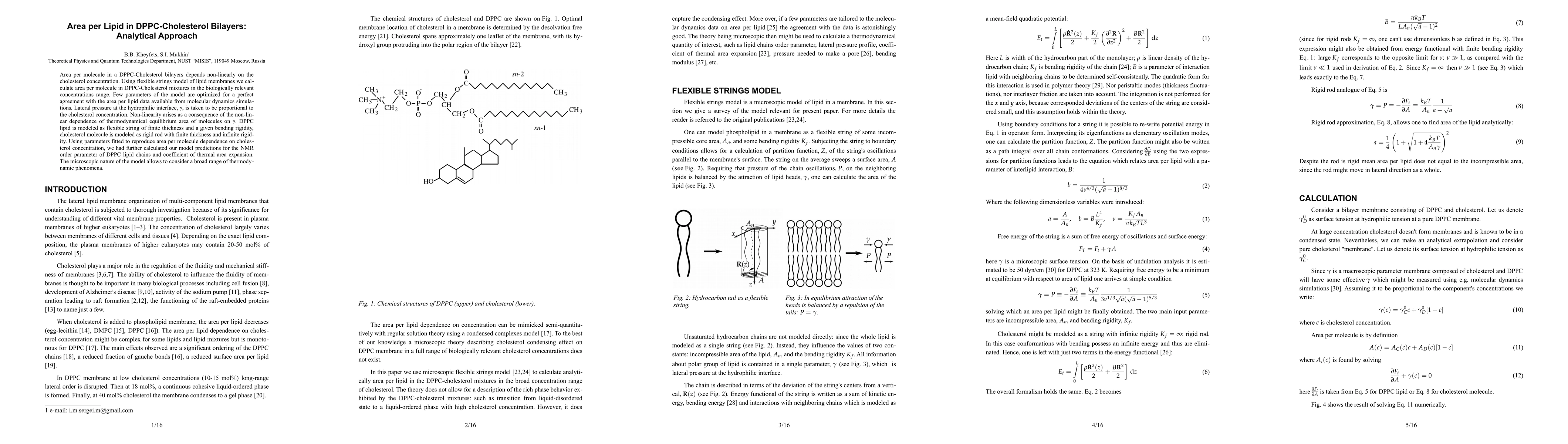 This paper uses a flexible strings model to analyze the area per molecule in DPPC-cholesterol bilayers, finding a non-linear dependence on cholesterol concentration. The model parameters are optimized to match molecular dynamics simulation data, providing predictions for NMR order parameters and thermal area expansion coefficients.