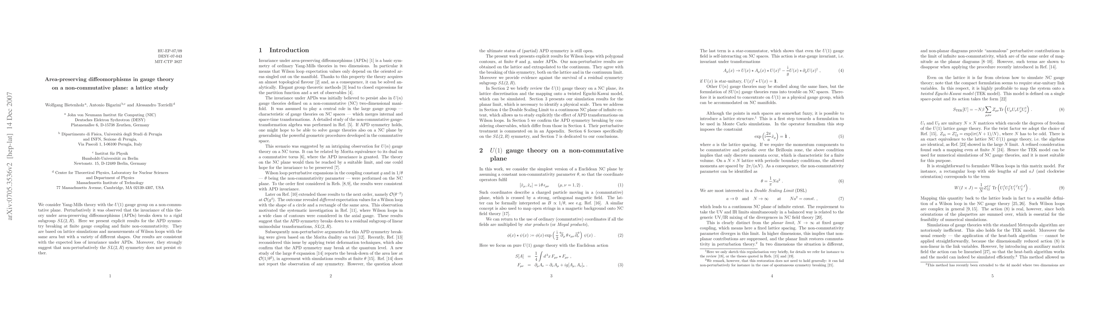 This paper investigates the breakdown of area-preserving diffeomorphisms (APDs) in Yang-Mills theory on a non-commutative plane using lattice simulations. The study finds that perturbative invariance under APDs is lost, and non-perturbatively, the expected rigid subgroup SL(2,R) symmetry also does not persist.