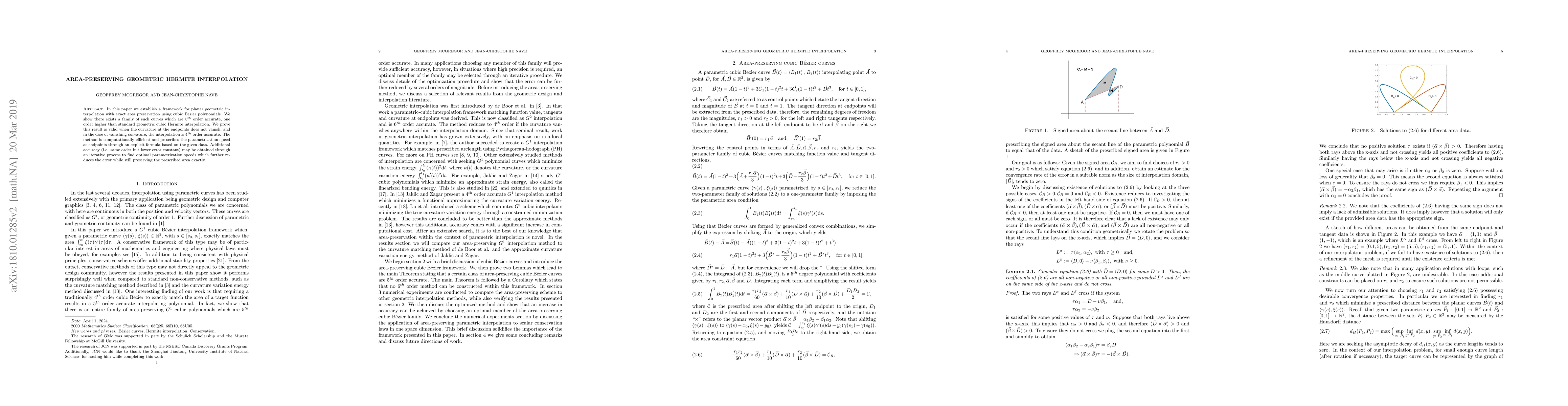 This paper introduces a framework for area-preserving geometric interpolation using cubic Bézier polynomials, achieving 5th order accuracy when endpoint curvatures do not vanish. It provides an efficient method to prescribe endpoint parametrization speeds and offers an iterative process for additional accuracy.