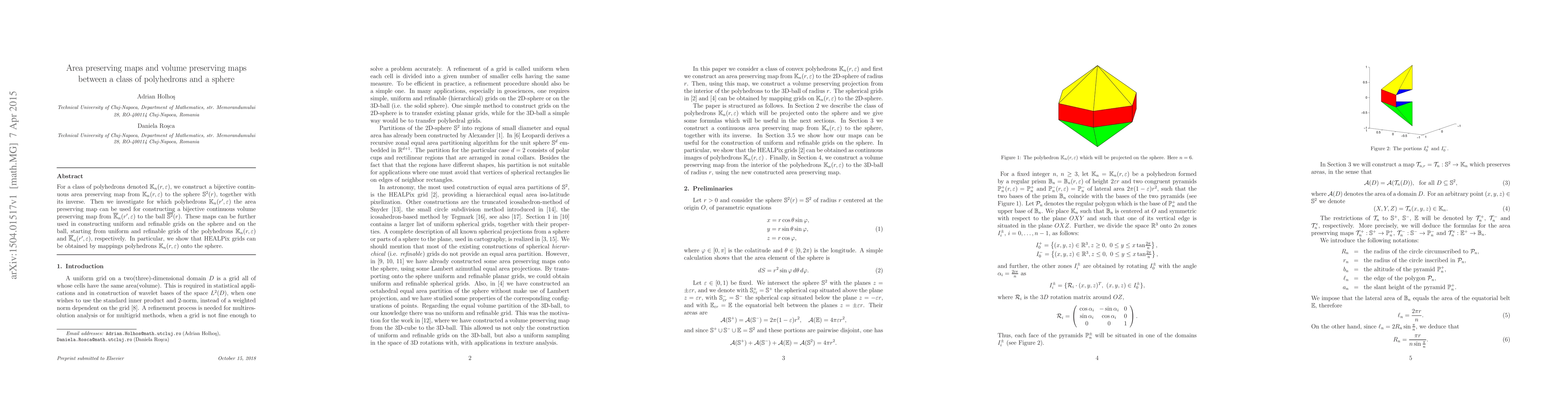 For a class of polyhedrons denoted $\mathbb K_n(r,\varepsilon)$, we construct a bijective continuous area preserving map from $\mathbb K_n(r,\varepsilon)$ to the sphere $\mathbb S^{2}(r)$, together with its inverse. Then we investigate for which polyhedrons $\mathbb K_n(r',\varepsilon)$ the area preserving map can be used for constructing a bijective continuous volume preserving map from $\bar{\mathbb K}_n(r',\varepsilon)$ to the ball $\bar{\mathbb S^{2}}(r)$. These maps can be further used in constructing uniform and refinable grids on the sphere and on the ball, starting from uniform and refinable grids of the polyhedrons $\mathbb K_n(r,\varepsilon)$ and $\bar{\mathbb K}_{n}(r',\varepsilon)$, respectively. In particular, we show that HEALPix grids can be obtained by mappings polyhedrons $\mathbb K_n(r,\varepsilon)$ onto the sphere.