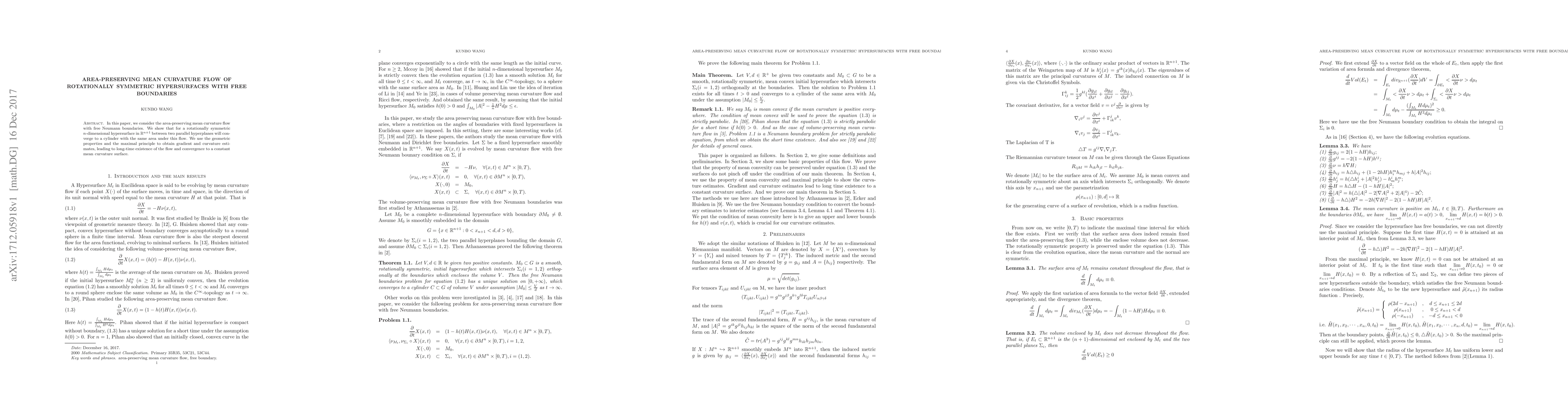 This paper studies the area-preserving mean curvature flow for rotationally symmetric hypersurfaces with free Neumann boundaries, proving that they converge to a cylinder with the same area under the flow. Gradient and curvature estimates are derived using geometric properties and the maximal principle, ensuring long-time existence and convergence to a constant mean curvature surface.