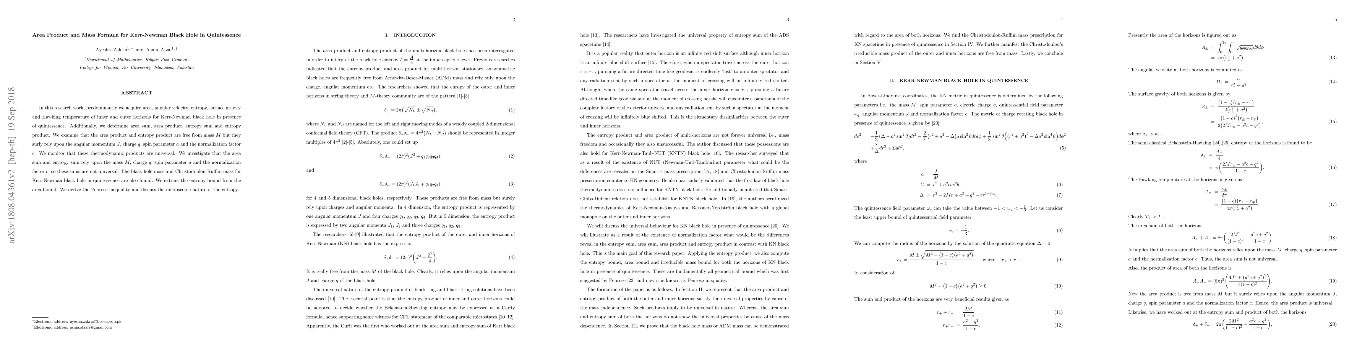 The development and application of new mathematical techniques to calculate the area, angular velocity, and entropy bound for the Kerr-Newman black hole in the presence of quintessence.
