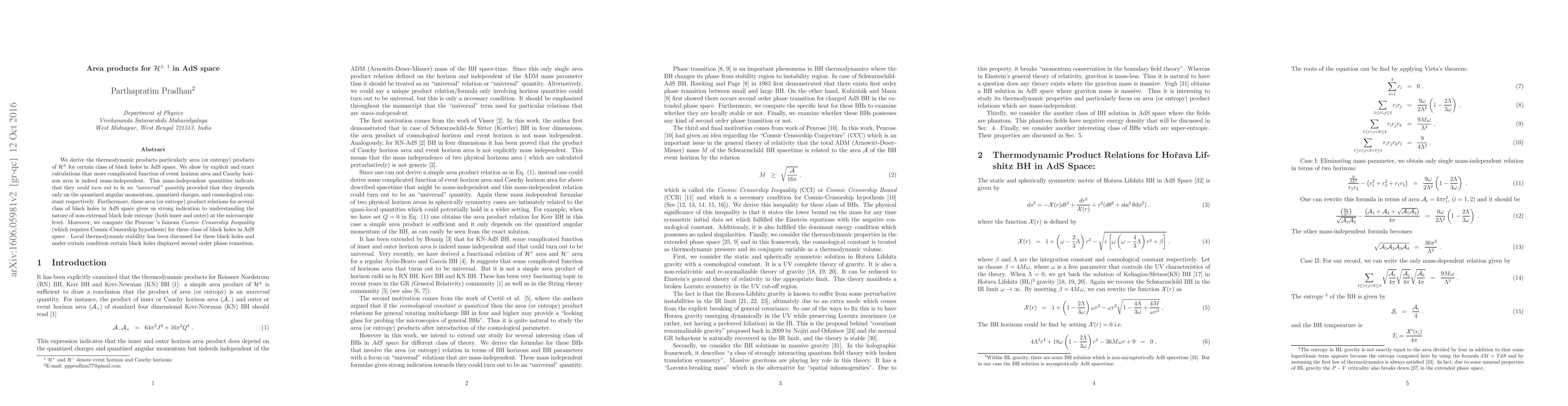 We derive the thermodynamic products particularly area (or entropy) products of ${\cal H}^{\pm}$ for certain class of black holes in AdS space. We show by explicit and exact calculations that more complicated function of event horizon area and Cauchy horizon area is indeed mass-independent. This mass-independent quantities indicate that they \emph{could turn out to be an "universal" quantity} provided that they depends only on the quantized angular momentum, quantized charges, and cosmological constant respectively. Furthermore, these area (or entropy) product relations for several class of black holes in AdS space gives us strong indication to understanding the nature of non-extremal black hole entropy (both inner and outer) at the microscopic level. Moreover, we compute the Penrose's famous \emph{Cosmic Censorship Inequality} (which requires Cosmic-Censorship hypothesis) for these class of black holes in AdS space . Local thermodynamic stability has been discussed for these black holes and under certain condition certain black holes displayed second order phase transition.