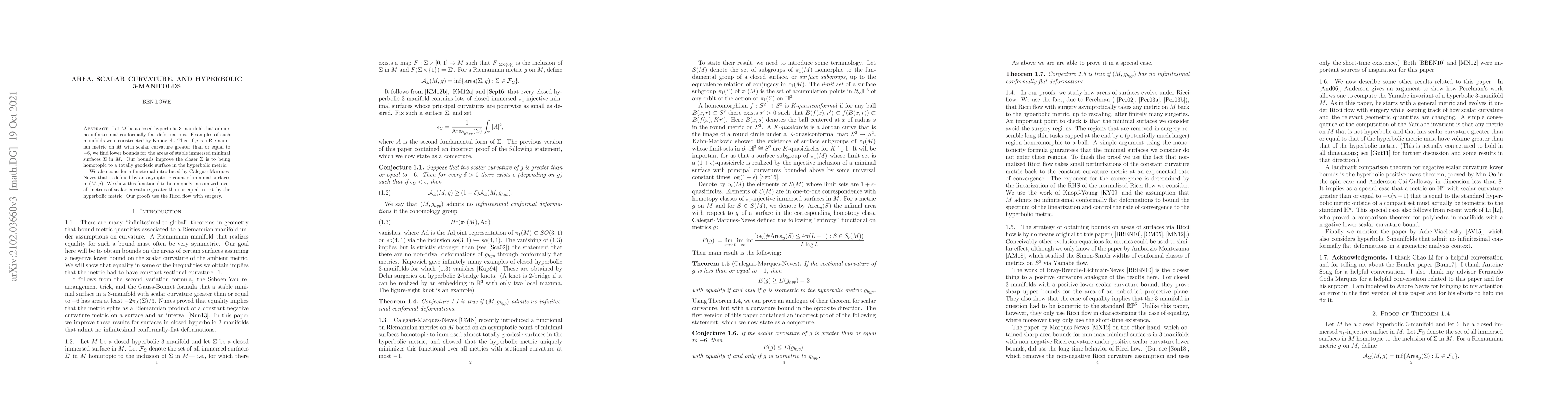 This paper explores the relationship between area, scalar curvature, and stable minimal surfaces in closed hyperbolic 3-manifolds without infinitesimal conformally-flat deformations. It establishes lower bounds for the areas of such minimal surfaces and shows that the hyperbolic metric uniquely maximizes a functional related to the count of minimal surfaces under these conditions, using Ricci flow with surgery.