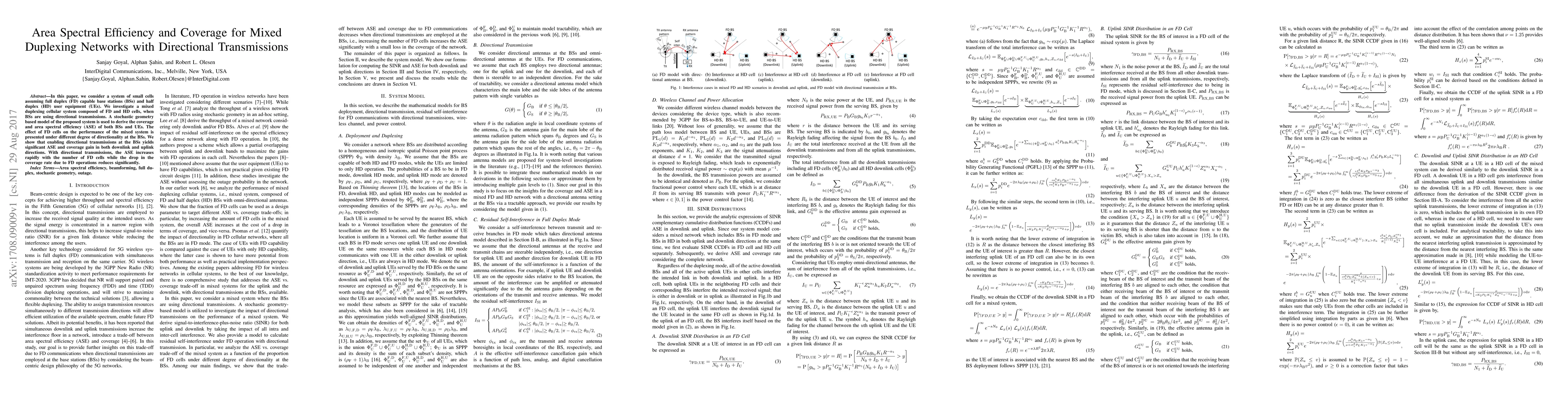 This paper examines a mixed duplexing cellular network with full duplex base stations and half duplex user equipment, utilizing directional transmissions. It employs stochastic geometry to derive coverage and area spectral efficiency, demonstrating significant gains in both metrics with directional transmissions, particularly as the number of full duplex cells increases.