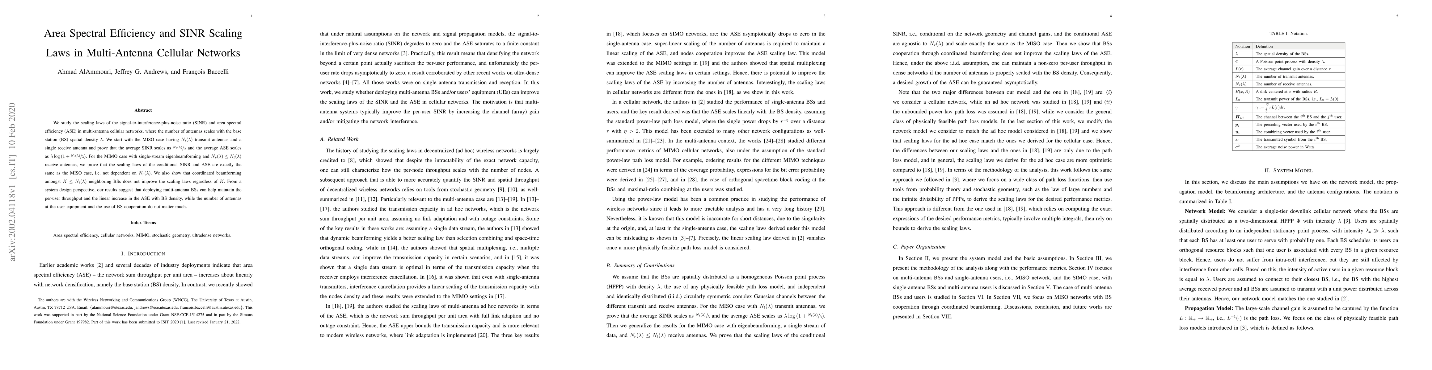 This paper investigates scaling laws for SINR and area spectral efficiency in multi-antenna cellular networks, finding that average SINR scales as $N_t(\lambda)/\lambda$ and average ASE as $\lambda\log(1+N_t(\lambda)/\lambda)$. Scaling laws remain consistent across MISO and MIMO cases, regardless of receive antenna count or BS cooperation.