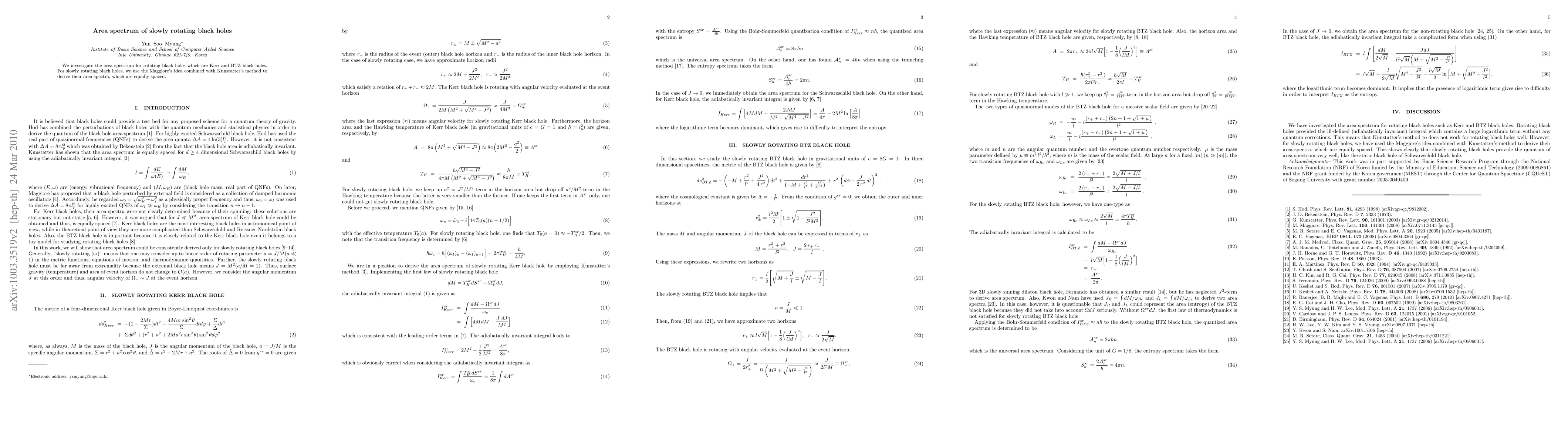 This paper explores the area spectrum of slowly rotating Kerr and BTZ black holes, employing Maggiore's concept and Kunstatter's method to derive equally spaced area spectra. The study reveals a quantized structure in the area of these black holes.