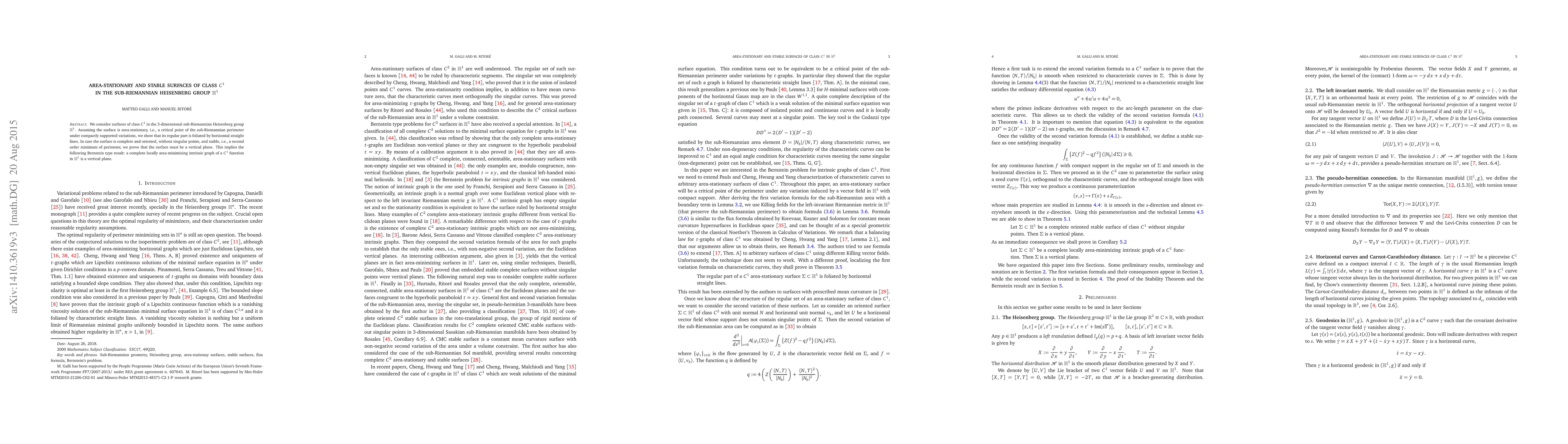 This paper investigates $C^1$ surfaces in the sub-Riemannian $3$-dimensional Heisenberg group ${\mathbb H}^1$. It proves that area-stationary surfaces are foliated by horizontal straight lines and that complete, oriented, stable surfaces are vertical planes, leading to a Bernstein theorem for locally area-minimizing intrinsic graphs in ${\mathbb H}^1$.