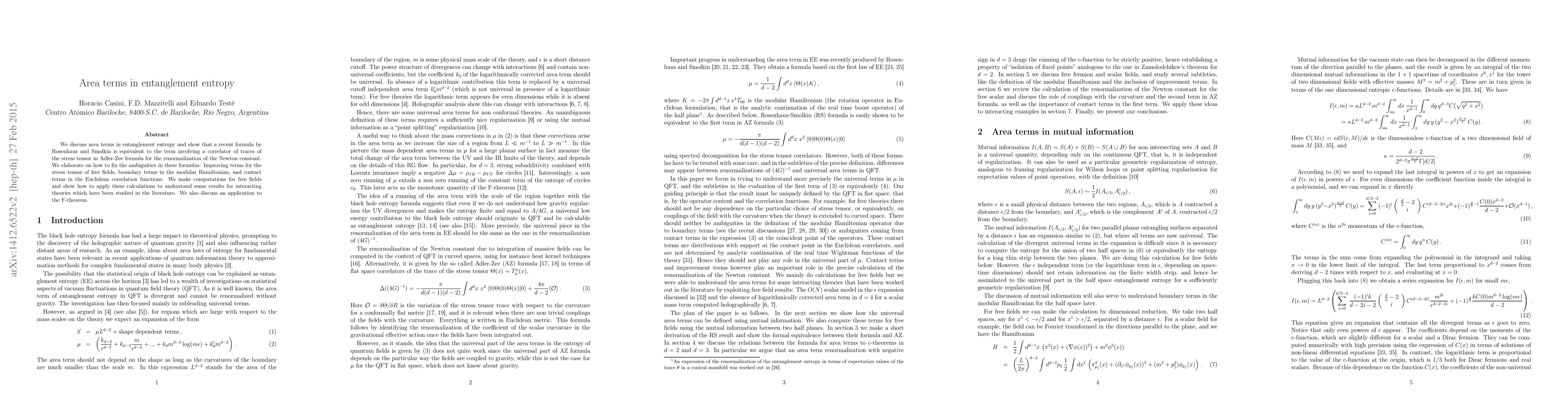 This paper explores area terms in entanglement entropy, showing their equivalence to stress tensor terms from Adler-Zee formula, and discusses methods to improve these formulas for free fields and interacting theories, with implications for the F-theorem.