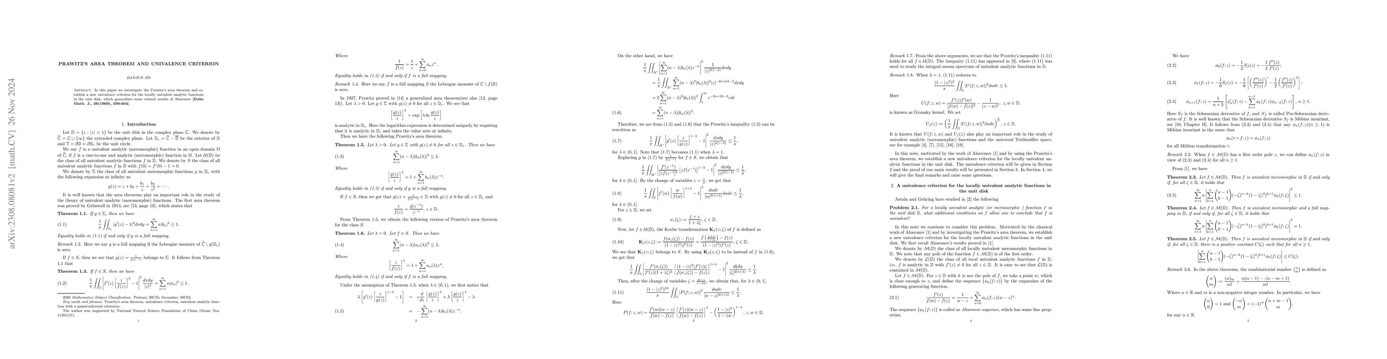 This paper explores Prawitz's area theorem and introduces a new univalence criterion for locally univalent analytic functions in the unit disk, extending previous findings by Aharonov.