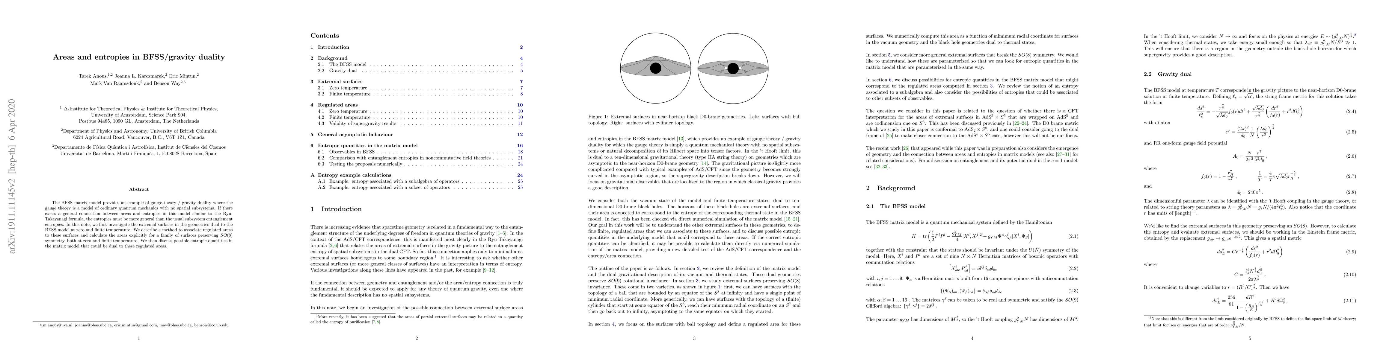 The BFSS matrix model provides an example of gauge-theory / gravity duality where the gauge theory is a model of ordinary quantum mechanics with no spatial subsystems. If there exists a general connection between areas and entropies in this model similar to the Ryu-Takayanagi formula, the entropies must be more general than the usual subsystem entanglement entropies. In this note, we first investigate the extremal surfaces in the geometries dual to the BFSS model at zero and finite temperature. We describe a method to associate regulated areas to these surfaces and calculate the areas explicitly for a family of surfaces preserving $SO(8)$ symmetry, both at zero and finite temperature. We then discuss possible entropic quantities in the matrix model that could be dual to these regulated areas.