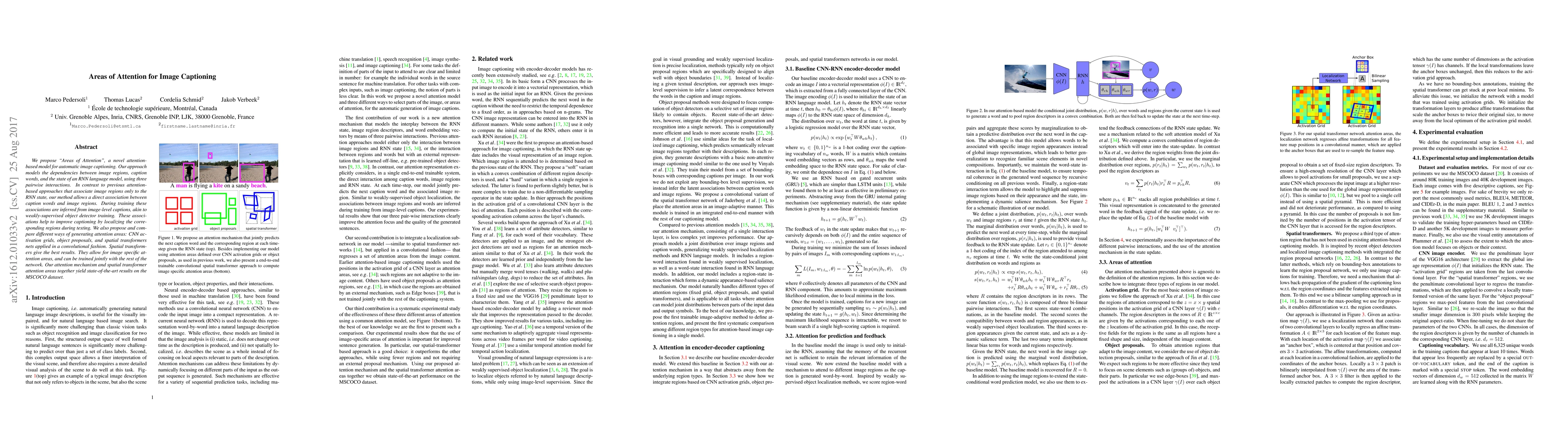 We propose "Areas of Attention", a novel attention-based model for automatic image captioning. Our approach models the dependencies between image regions, caption words, and the state of an RNN language model, using three pairwise interactions. In contrast to previous attention-based approaches that associate image regions only to the RNN state, our method allows a direct association between caption words and image regions. During training these associations are inferred from image-level captions, akin to weakly-supervised object detector training. These associations help to improve captioning by localizing the corresponding regions during testing. We also propose and compare different ways of generating attention areas: CNN activation grids, object proposals, and spatial transformers nets applied in a convolutional fashion. Spatial transformers give the best results. They allow for image specific attention areas, and can be trained jointly with the rest of the network. Our attention mechanism and spatial transformer attention areas together yield state-of-the-art results on the MSCOCO dataset.o meaningful latent semantic structure in the generated captions.