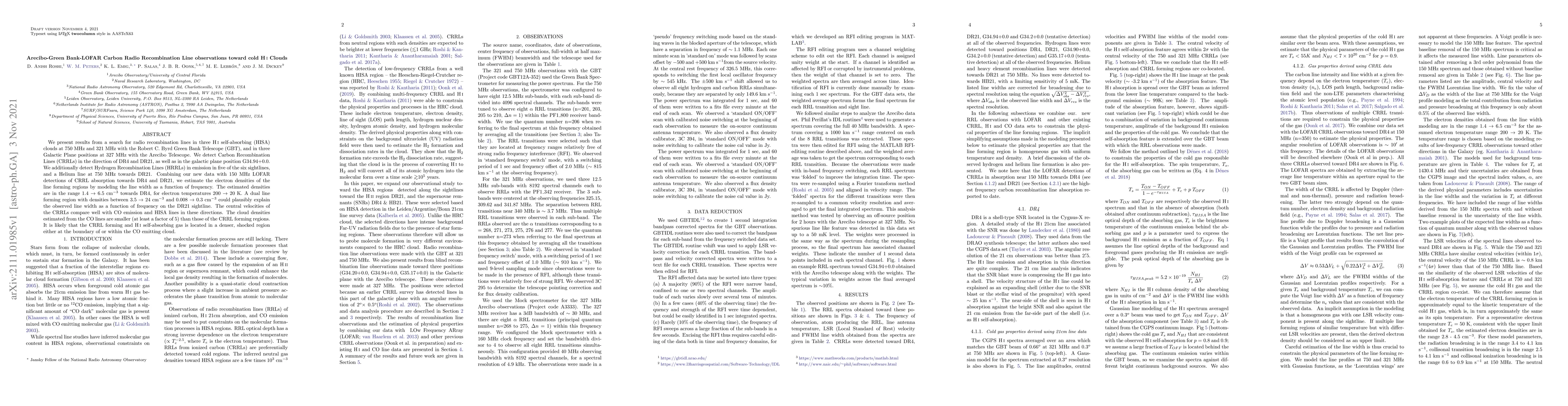 We present results from a search for radio recombination lines in three HI self-absorbing (HISA) clouds at 750 MHz and 321 MHz with the Robert C. Byrd Green Bank Telescope (GBT), and in three Galactic Plane positions at 327 MHz with the Arecibo Telescope. We detect Carbon Recombination Lines (CRRLs) in the direction of DR4 and DR21, as well as in the galactic plane position G34.94+0.0. We additionally detect Hydrogen Recombination Lines (HRRLs) in emission in five of the six sightlines, and a Helium line at 750 MHz towards DR21. Combining our new data with 150 MHz LOFAR detections of CRRL absorption towards DR4 and DR21, we estimate the electron densities of the line forming regions by modeling the line width as a function of frequency. The estimated densities are in the range 1.4 $\rightarrow$ 6.5 cm$^{-3}$ towards DR4, for electron temperatures 200 $\rightarrow$ 20 K. A dual line forming region with densities between 3.5 $\rightarrow$ 24 cm$^{-3}$ and 0.008 $\rightarrow$ 0.3 cm$^{-3}$ could plausibly explain the observed line width as a function of frequency on the DR21 sightline. The central velocities of the CRRLs compare well with CO emission and HISA lines in these directions. The cloud densities estimated from the CO lines are smaller (at least a factor of 5) than those of the CRRL forming regions. It is likely that the CRRL forming and HI self-absorbing gas is located in a denser, shocked region either at the boundary of or within the CO emitting cloud.